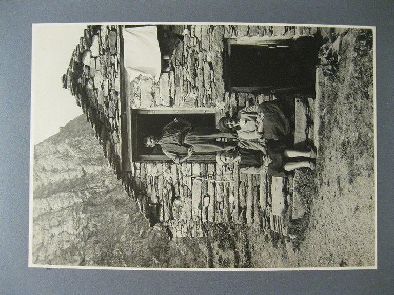 Diciassette fotografie originali in b/n vintage, stampa alla gelatina ai sali d'argento, didascalie manoscritte al verso, 4 sono di piccolo formato (6,5 x 8,5) sono montate su due cartoncini bordati cm 24,5 x 17 (due fotografie applicate su un cartoncino e due sull'altro). Ritraggono paesaggi e persone della Val di Rima, la parete del monte Tagliaferro, Rimasco, Rima S. Giuseppe. Le altre dieci sono di formato maggiore, montate su cartoncini bordati cm 24,5 x 34. Tre di queste (cm 13,8 x 8,7; 16,7 x 12; 16,7 x 12) ritraggono tre vedute del paese di Rima S. Giuseppe; due (cm 12,7 x 8,7; 11,7 x 16,7) ritraggono due vedute del paese di Rimasco; una cm 13,7 x 8,7 ritrae un uomo in bicicletta seduto su un muretto che delimita una strada, alle sue spalle una veduta del paese di Boccioleto; una cm 11,7 x 16,5 ritrae un uomo vicino ad alcune case in pietra delle Alpi Valmontasca; una cm 8,7 x 13,8 ritrae un uomo semisdraiato su una lastra di pietra presso il Colle Moud; le ultime tre (cm 11,7 x 16,7; 17 x 12; 16 x 11) ritraggono una famiglia davanti alla loro casa in pietra, un uomo sdraiato in un prato nella zona delle Alpi Vorcu; un uomo davanti a casupole di pietra con vita sulle Alpi Vorcu e il Colle Moud.