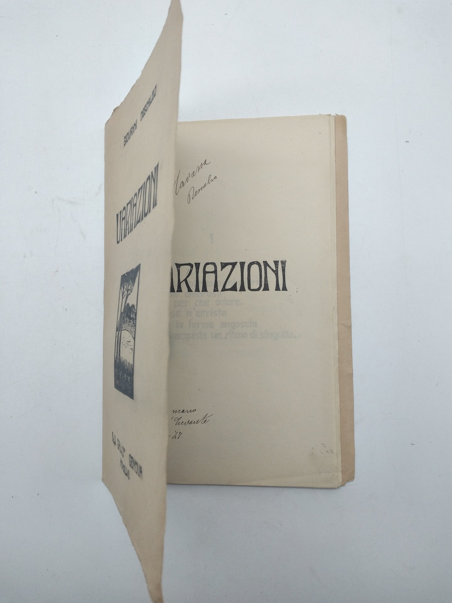 In 8o (cm 15 x 22,5 circa), pp. (40) stampate in xilografia al solo recto dei fogli (verso bianco). Brossura editoriale con due xilografie ai piatti, 3 xilografie a piena pagina e capilettera xilografati di Eugenio Maria Raffo. Edizione tirata a mano, in limitatissimo numero di copie (tiratura non dichiarata) su carta giapponese, testo e immagini in xilografia. Esemplare arricchito dalla dedica autografa di Descalzo al frontespizio con l'aggiunta, manoscritta, della dicitura "Tirata a mano in Sestri Levante il 20-9-47". Edizione originale di questa raccolta poetica comprendente 15 componimenti dello scrittore ligure Giovanni Descalzo (Sestri Levante, 1902 - 1951). "La plaquette fu ripetutamente ristampata negli anni successivi su carta e con stampa di qualita' molto inferiore" (Gambetti, Vezzosi, 319). "Descalzo [.] egli e' poeta del suono piu' che della vista [.]. Nel momento della messa in discussione dell'ermetismo degli anni Trenta Descalzo offre con Variazioni i fossili di una era preermetica, estranei a quel movimento verso l'ermetismo che egli invece aveva compiuto. E' singolare, ad esempio, che rispuntino in Variazioni figure come l'iperbato, o che si ricuperino senza motivazione stilemi dell'Allegria ungarettiana (ad esempio: "Ho posato un istante / sull'isola brulla che avanza / senza nome i ricordi / per farne sabbia e deserto" (Marziano Guglielminetti, "Sbarbaro poeta, ed altri liguri", Palermo, Flaccovio, 1983, p. 64).