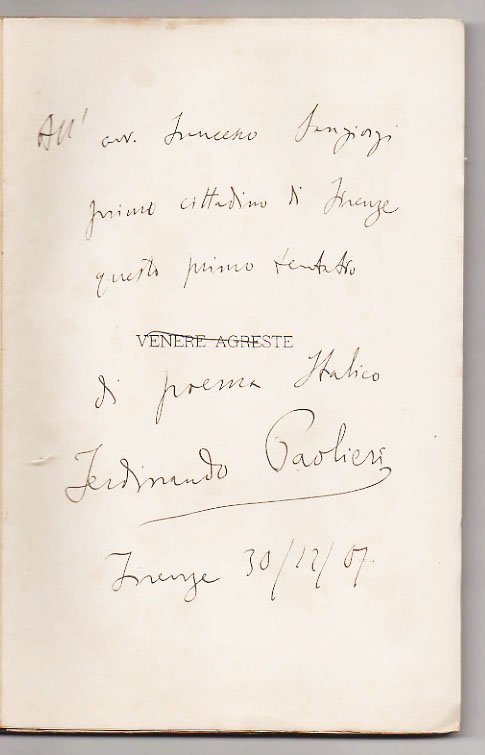 LIBROEdizione originale. CON AUTOGRAFO.Ottimo esemplare pregiato da bella dedica autografa dell’autore: «All’avv. Francesco Sangiorgi | Primo cittadino di Firenze | questo primo tentativo | di poema Italico | Ferdinando Paolieri | Firenze 30/12/07».Raro. Poema in ottave di gusto simbolista, in straordinaria confezione editoriale liberty con eleganti disegni fuori testo impressi in blu e sanguigna di F. Marfori-Savini, U. Brunelleschi, N. Faorzi, A Bastianini, Ludovico Tommasi, Silvio Bichi, Beppino Del Chiappa. L’opera fu ristampata con aggiunte da Nerbini nel 1911 e da Treves nel 1924.