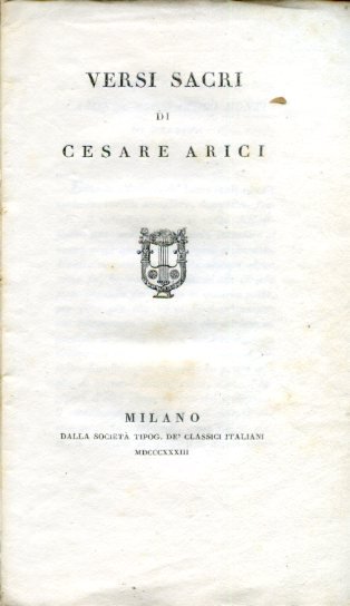 In 16, pp.120, brossura editoriale rosa con piccola vignetta inquadrata entro bordura di greche. Rare bruniture. Buon esemplare. Prima edizione. Cesare Arici (Brescia, 1782-ivi, 1836) fu poeta neoclassico e professore di Storia nel Liceo di Brescia. Sono presenti versi in lode di Gesù, di Maria, di San Giuseppe, di San Paolo, dell'Angelo Custode, del Rosario, degli Apostoli, per la morte del Vescovo di Brescia, Gabrio Maria Nava, etc.