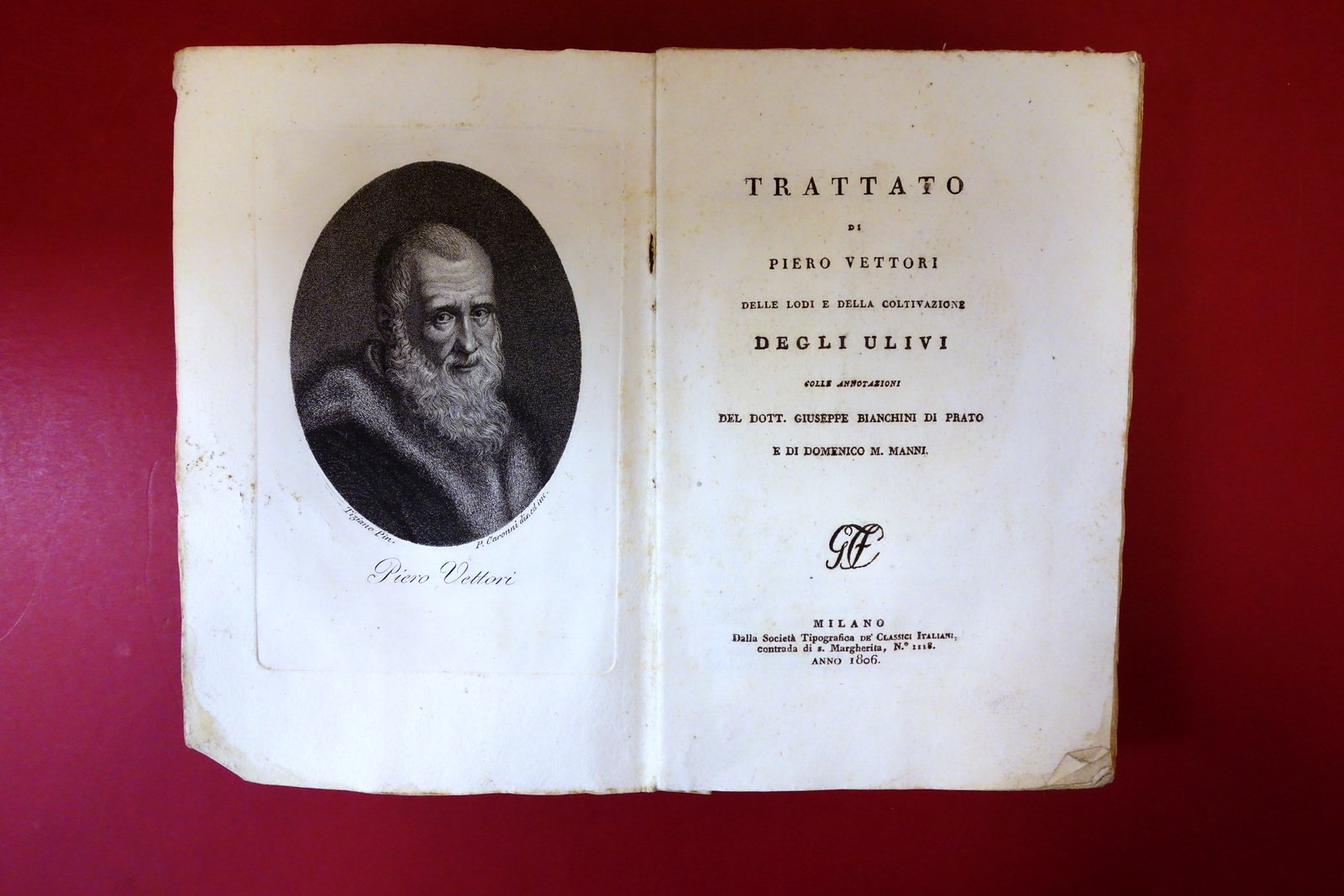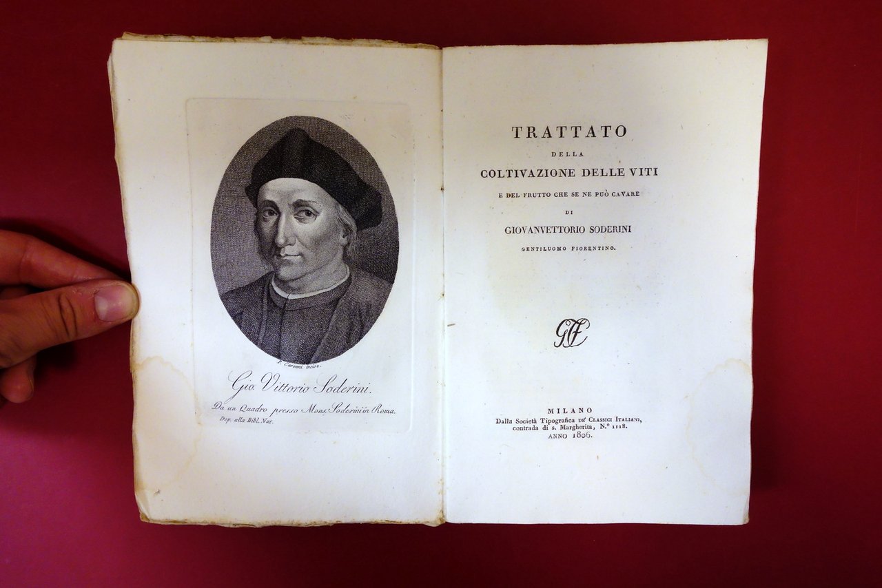 2 opere rilegate in volume; Soc. Tip. dei Classici Italiani, Milano, 1806; cm 21,5x14; pp. [2]-183-[1], con un ritratto calcografico dell'autore all'antiporta, P. Caronni incise (Vettori - della coltivazione degli ulivi); pp. [2]-253-[3], con un ritratto calcografico dell'autore all'antiporta - P. Caronni incise (Soderini - Trattato della coltivazione delle viti); interni marginosi, con barbe. Cartoncino ed. d'attesa. Due importanti pubblicazioni rinascimentali sui rispettivi argomenti, più volte ristampate, rilegate in un unico volume.