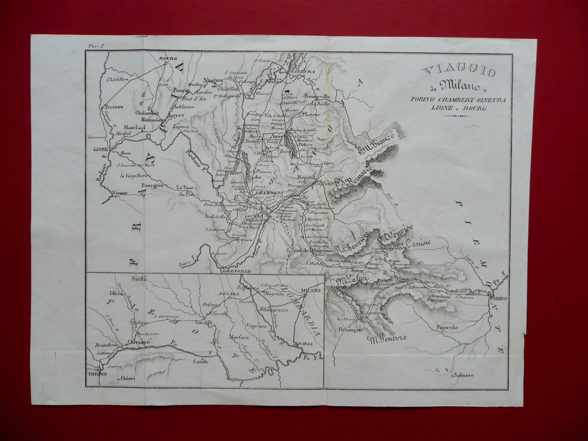 Viaggio da Milano a Torino Chambery Ginevra Lione Bourg Carta Incisione '800