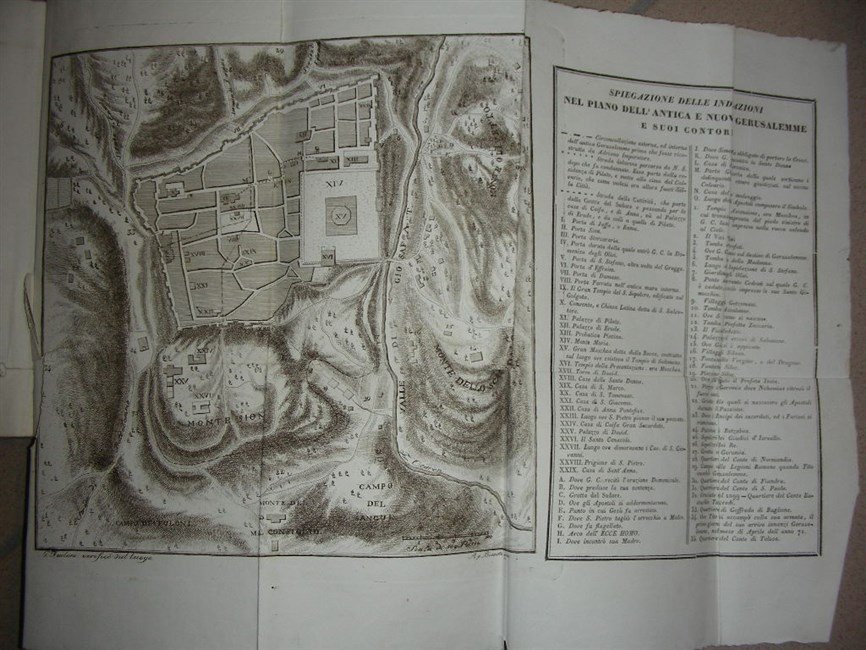 in-8 gr., pp. XII, 196, 2, leg. cartone edit. con cornici xilogr. ai piatti con tit. Con 2 gr. carte inc. in rame ripp. al fine e raff. la pianta topografica di Gerusalemme e il Tempio, con rilievi compiuti sul luogo dell’A. stesso. Racconto del viaggio compiuto in tre anni dall’A. Manca alle bibliografie consultate. Strappo lungo alla piegatura delle tavv. Macchia di inchiostro all’angolo sup. destro delle ultime 5 cc. Manca il ritratto dell'A. Raro. Bell’esempl. a pieni margini.