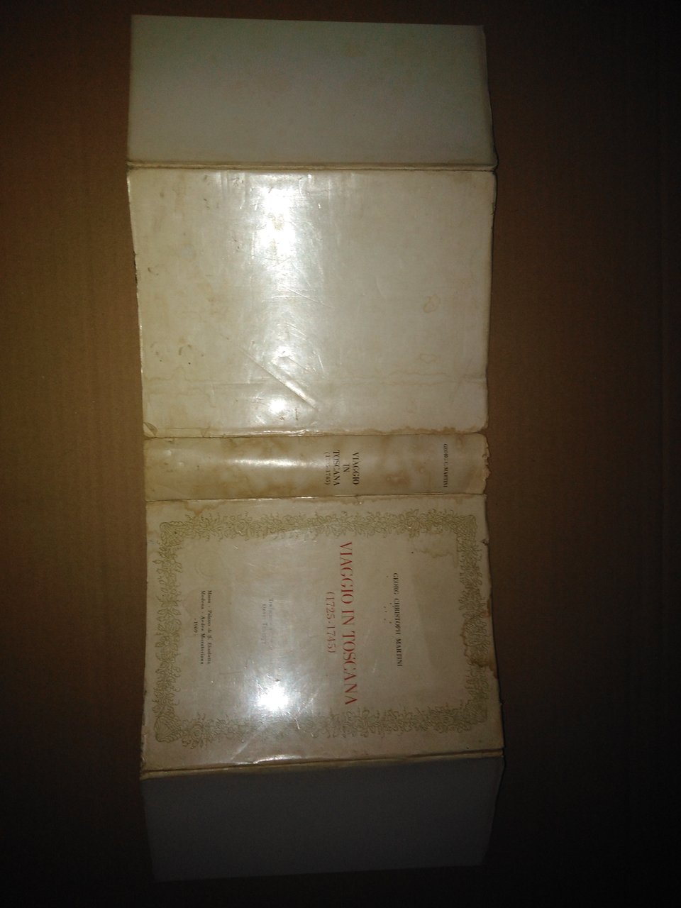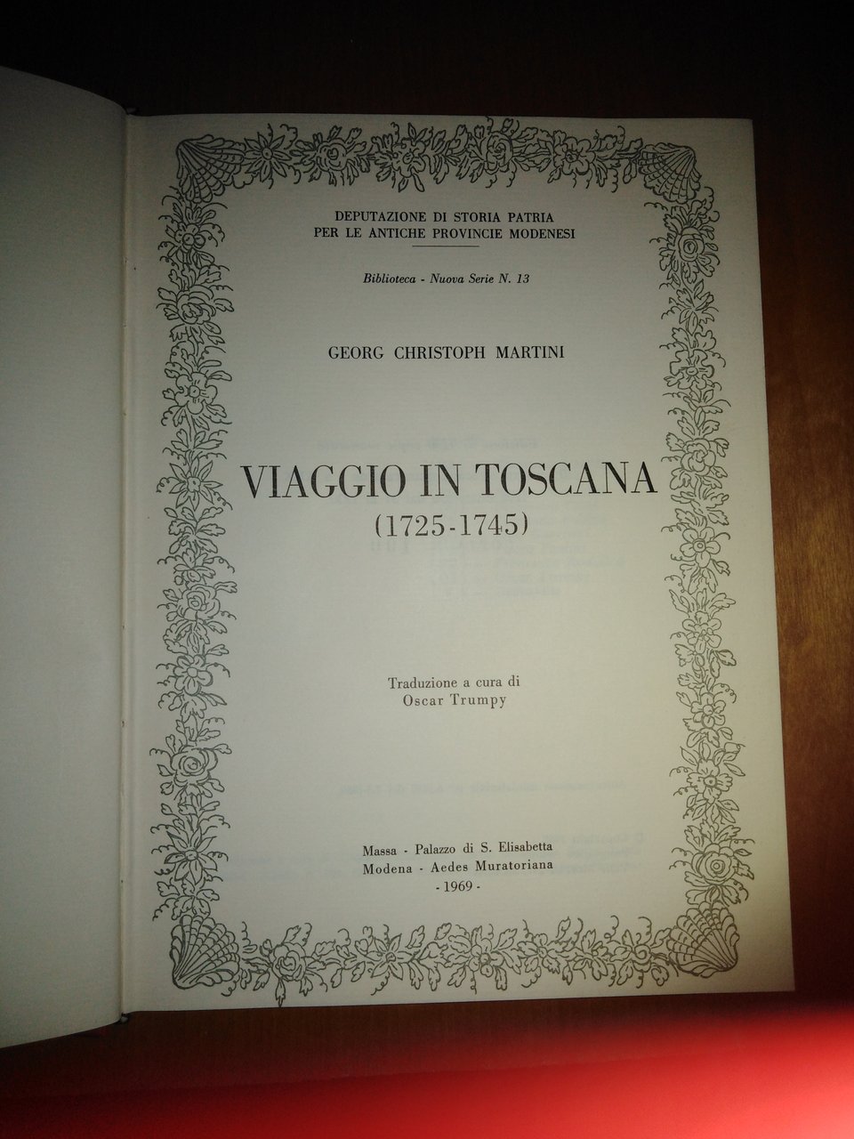 GEORG CHRISTOPH MARTINI, Viaggio in Toscana (1725-1745) - 1969. A cura della Deputazione di Storia Patria per le Antiche Provincie Modenesi. Traduzione dal tedesco di Oscar Trumpy. Pubblicazione presentata al Palazzo S.Elisabetta di Massa e alla "Aedes Muratoriana" di Modena. Tiratura limitata di 1230 esemplari numerati (copia n. 100). Importante pubblicazione di un inedito, voluminoso manoscritto conservato presso l'Archivio di Stato di Lucca, ove il Martini, più noto come il Pittor Sassone, nato a Langensalza in Sassonia, dimorò per diciotto anni e morì nel 1745.-