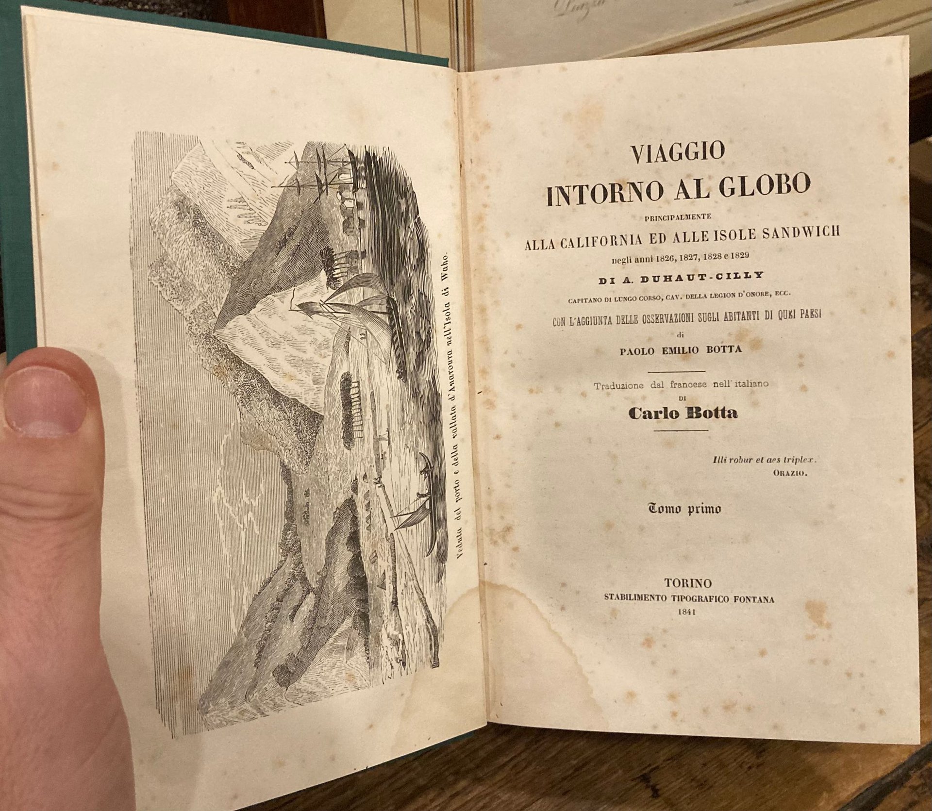 2 voll. in un tomo in-8° (20x13 cm), pp. XVI, 296; 392, (2) di errata; legatura in tutta tela rigida verde novecentesca con titoli dorati al dorso. Due antiporte incise con vedute l una del porto di Anaroura, l altra dell'isola di Waho di Ross ('Stabilimento Russo vicino alla Bodega'); tra le pp. 250-251 del primo vol., veduta di Monterey nell Alta California presa dalla rada; tra le pp. 174-175 del secondo volume veduta della californiana missione di San Luis Rey; tavole tabelle nel testo. Un lieve alone a mezzaluna evanescente al piede delle prime pagine e alle testa delle ultime peraltro più che buon e fresco esemplare. Prima traduzione italiana, dovuta a Carlo Botta, del Voyage autour du monde, principalement a la Californie et aux Iles Sandwich, pendant les annees 1826, 1827, 1828, et 1829, importante resoconto di viaggio nel continente americano e nelle Isole Sandwich (le Hawaii) compiuto da un capitano di marina, letterato e mercante francese. Notazioni geografiche ed etnografiche su Rio de Janeiro e il Brasile, Capo Horn, le Ande, il Cile e Valparaiso, il Perù e Lima, il Messico, San José, San Francisco, Santa Cruz, Monterey, Santa Barbara e la sua missione spagnola, San Pedro, San Diego, Santa Clara, Los Angeles (allora ancora modesto pueblo, in cui l'autore conta appena 82 case per un totale di un migliaio di persone circa), le Hawaii, la Cina e Canton, Macao, Sant'Elena. In appendice al secondo vol., alle pp. 339 e sgg., 'Osservazioni sugli abitanti delle Isole Sandwich e della California' di Paolo Emilio Botta (l'archeologo, figlio di Carlo Botta, che aveva accompagnato il Duhaut-Cilly nel suo viaggio americano), un compendioso vocabolario hawaiiano ('Italiano-Sandwiccese'), esempio di numerazione hawaiiana ('numeri sandwiccesi') e varie altre osservazioni dello stesso Paolo Emilio Botta sugli abitanti della California e delle Hawaii. I capitoli finali del Botta compaiono qui in edizione originale. 'This commercial enterprise, although a financial failure, resulted the first foreign account of Spanish California by a literate and observant French trader, who, while trying to sell his goods, visited most of the missions, presidios, and pueblos of Alta California, and wrote the best contemporary account of the region. He had a splendid opportunity to observe affairs and took advantage of it, being the first outsider to become intimately acquaninted with the the thriving area. The ship Héros also visited Valparaiso, the Galápagos Islands, Hawaii, Macao, and Java' (The Hill Collection of Pacific Voyages). Il Duhaut-Cilly, vissuto tra il 1790 e il 1849, effettuò i suoi viaggi attraverso il mondo fra il 1826 e il 1829; lasciò varie altre relazioni odeporiche, tra cui una di viaggio in Russia. Sabin, 21164. Cowan, II,186. Howell, 50:64. Howes, D-547. Zamorano, 80:32. Silveira De Braganza-Oakes, The Hill Collection of Pacific Voyages, 23-24. Hill, p. 23. Forbes, 882.