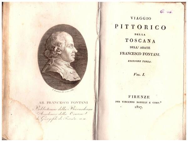 16° (cm. 16 x 10) mezza tela coeva, tit. oro ai dorsi, 6 tomi in 3 volumi, pp. XVI-365, 338, III; 284, III; 283, III; 310, III; 298, XI. Ritr. dell'A.inciso all'antip. del 1° vol., con 213 tavole fuori testo incise all'acquaforte, una carta ripieg. della Toscana e 4 piante di città ripieg. ft. Qc. lieve brunitura ma bell'es. marginoso e con tavole nitide. Rara opera che illustra tutti i luoghi e le città della Toscana.