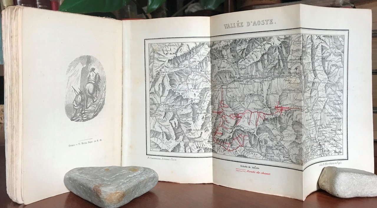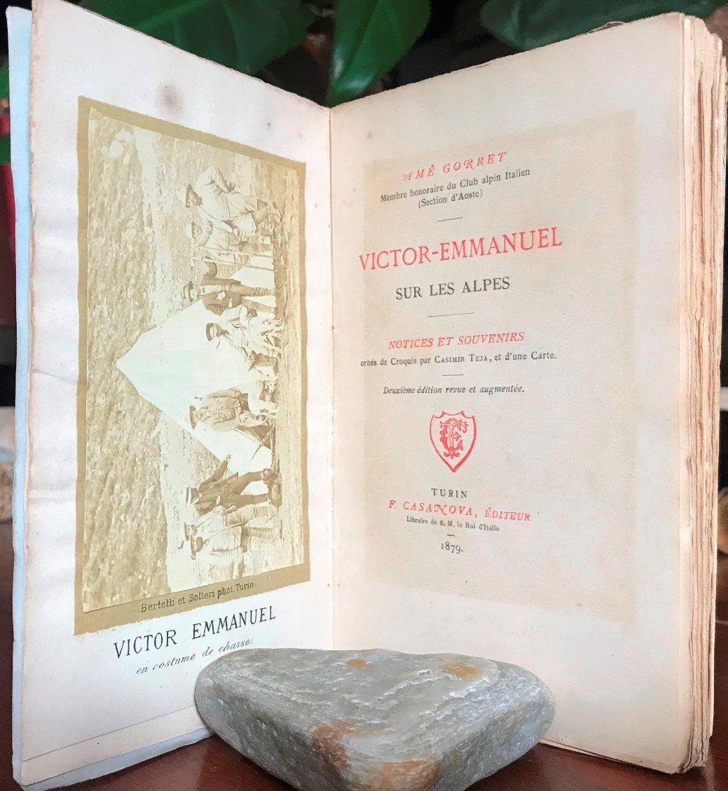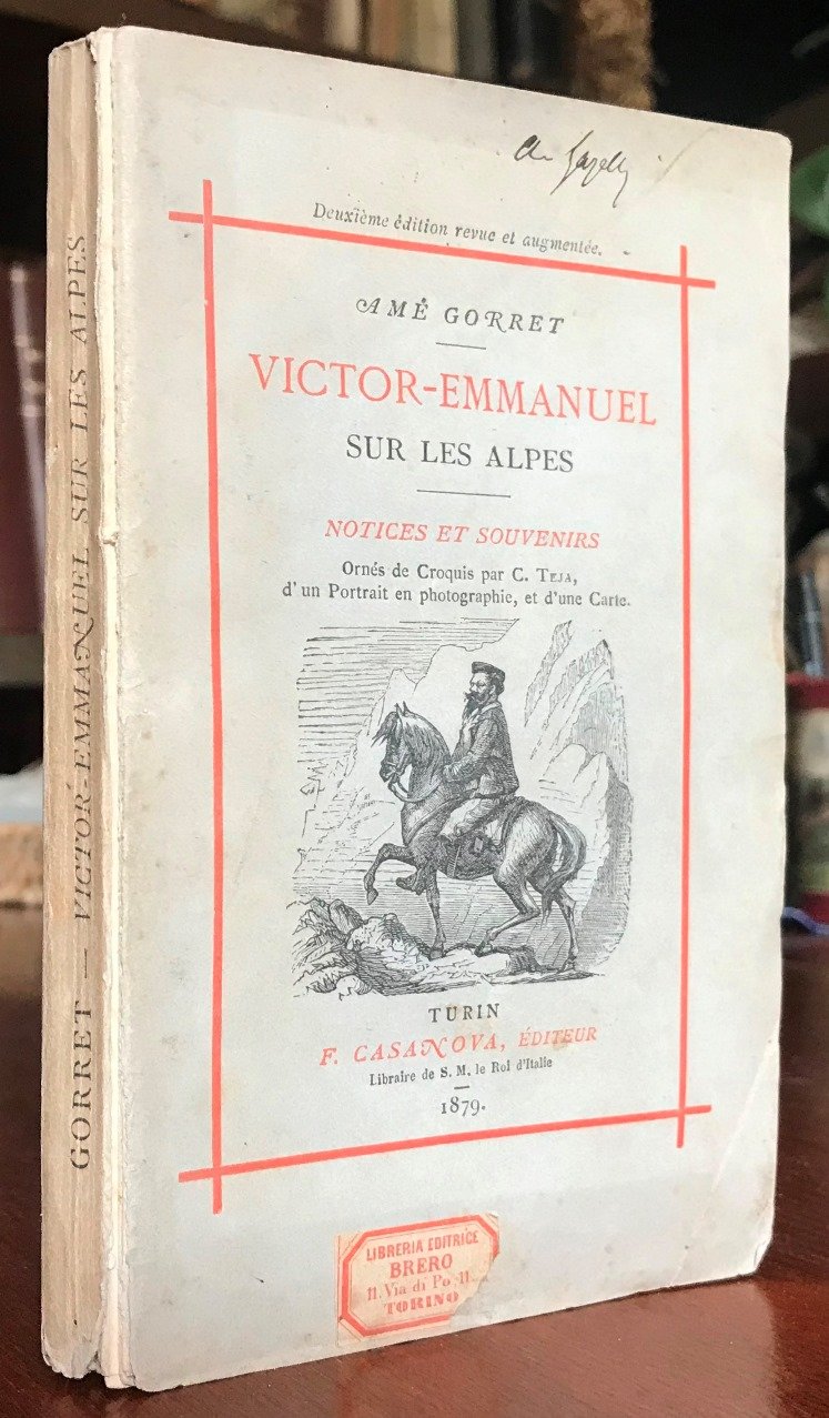 Volume in 12, brossura editoriale figurata, riquadro rosso ai piatti che racchiude due diverse xilografie che rappresentano il sovrano a cavallo sui passi di montagna, titolo in rosso e nero al piatto ed al dorso, piccola firma d'appartenenza a pennino, occhiello, antiporta con fotografia applicata (Torino, Bertelli e Sotteri) che ritrae, un gruppo di cacciatori con alcuni cani davanti ad una tenda da campo, tra cui figura Vittorio Emanuele in tenuta da caccia. Frontespizio in rosso e nero, dedicatorie dell'autore ad A. E. Martelli ed R. H. Budden (membri del CAI), 104 pp., 8 litografie color seppia (una per ciascun capitolo) raffiguranti Vittorio Emanuele II sulle Alpi, scene venatorie, l'accampamento di Orvieille, il castello di Sarre, ecc., il tutto da invenzione di Teja, cui si debbono anche le graziose testatine, i capilettera e i finaletti incisi n.t., ed una grande carta geografica della Valle d'Aosta ripiegata ed, in fine, 16 pp. di pubblicit editoriale. Seconda edizione, molto rara, stampata un anno dopo la prima, differisce da questa per piccole aggiunte in appendice ma, soprattutto per la presenza della bella fotografia ottocentesca applicata in antiporta, un valore aggiunto a questa bella opera dedicata a Vittorio Emanuele II, grande amante della caccia e della montagna. Un omaggio da parte dell'autore (Valtournenche, 1836 - Saint-Pierre, 1907), presbitero e alpinista italiano (incontr il re il 1 agosto 1861, lo stesso anno in cui ricevette gli ordini), in grande amicizia col sovrano grazie alla passione comune per la montagna. Il piatto anteriore parzialmente slegato, per il resto il volume in pi che buono stato, interno fresco e pulito, lievissime mende alla brossura. Raro.