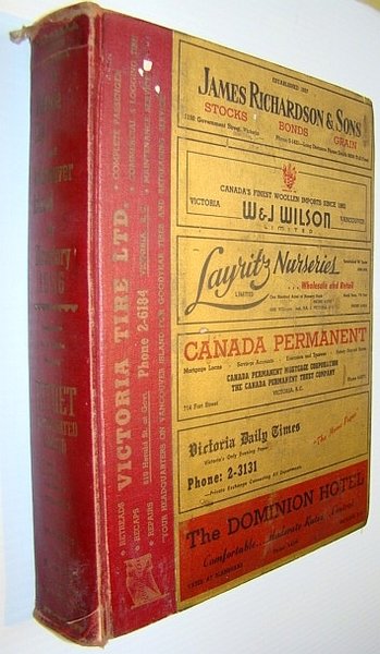 814 pages. Provides an excellent snapshot of Vancouver Island in the year 1956. "Containing an alphabetically arranged list of business houses; private citizens; civic, provincial and dominion governments; churches; public and private schools; secret and benevolent organizations; also an avenue and street guide section with telephone numbers for Victoria, Nanaimo and Port Alberni cities; also a classified business directory." - from title page. Above-average external wear. Hinges starting. A worthy copy of this excellent reference. Book