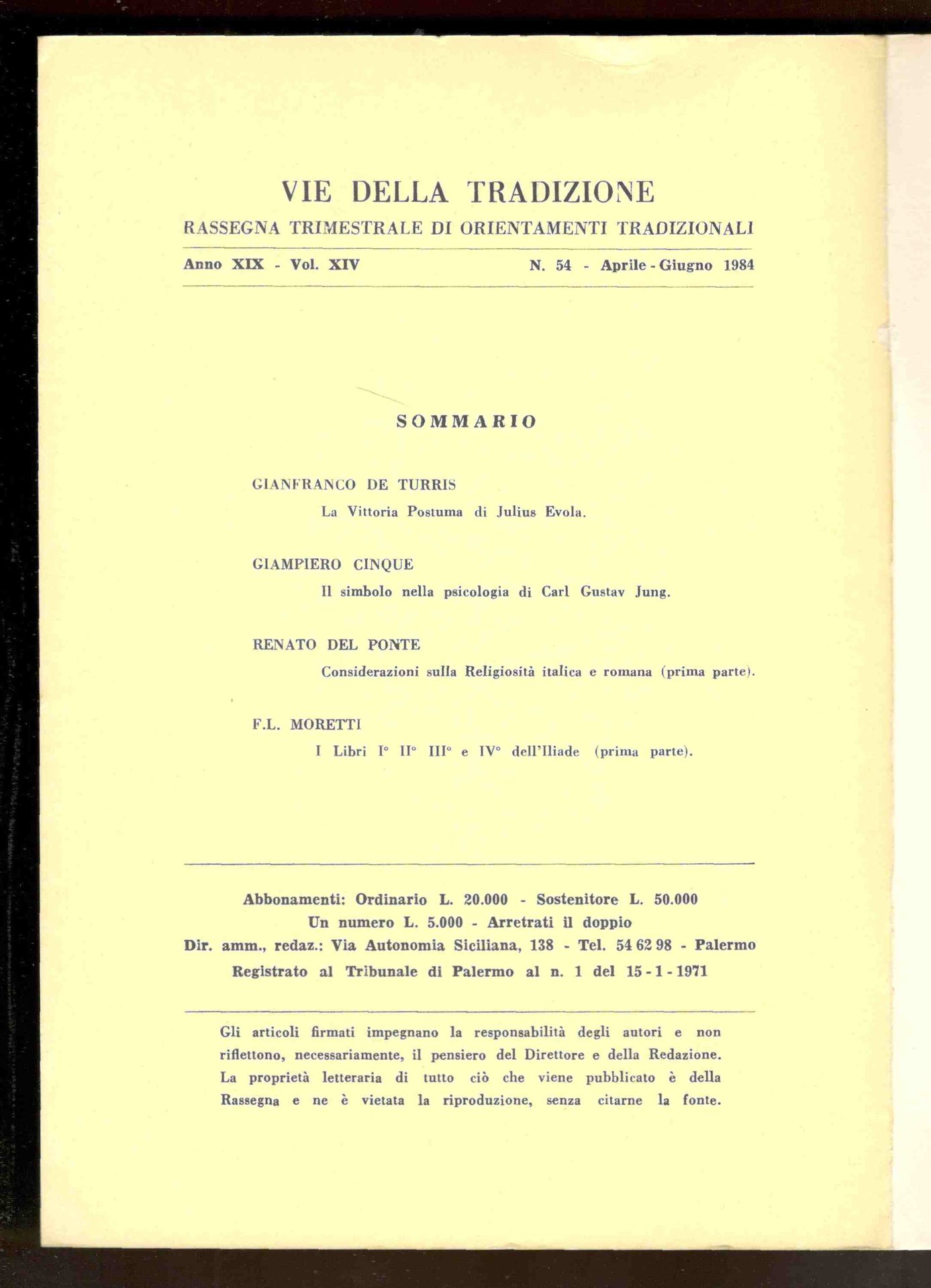 Vie della tradizione. Rassegna trimestrale di orientamenti tradizionali. Anno XIX - Vol. XIV. N. 54. Aprile-Giugno 1984