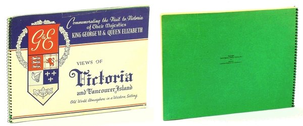 pp. [42]. "Commemorating the visit to Victoria [B.C.] of their majesties King George VI and Queen Elizabeth." - front cover. This visit took place in May 1939 as part of a major North American tour at a time when another major war in Europe seemed imminent. Queen Elizabeth II took part in the tour and is said to have 'lost her heart to Canada and Canadians' as a result. Oblong 9" x 12". Each page contains a black and white reproduction of a photo of a noteworthy site in the Victoria region or up-island. Some noteworthy details include angle parking on Douglas and Yates, jaunty men's golf fashions of the day, a marvelous view of Saanich farm lands from Mount Douglas, the Italian gardens and residence of Mr. Butchart, tall timber along Cowichan Bay Road, the Malahat Drive alongside Goldstream, and a day's catch of huge fish near Victoria. Unmarked with moderate wear. A quality copy of this excellent memento and snapshop of life in Victoria and on Vancouver Island in 1939. Not listed in Edwards & Lort. Book