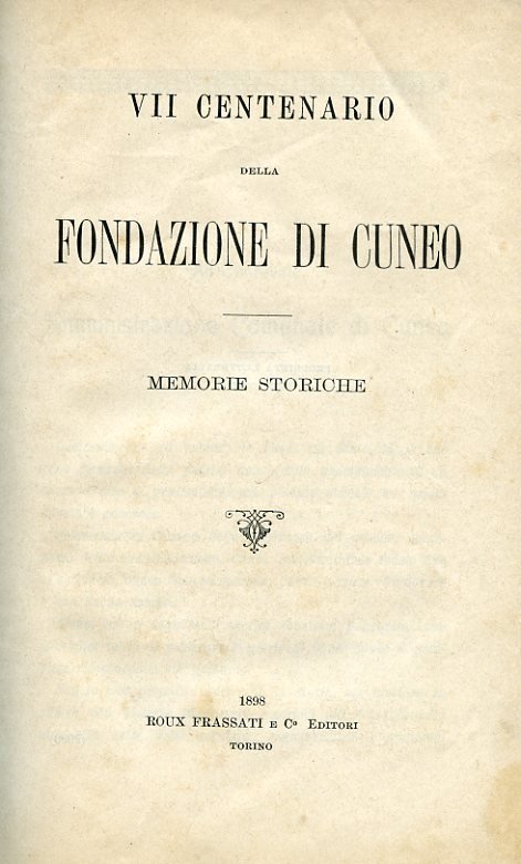 In-8°, pp. XXX, 506, (1), legatura in mezza pelle moderna bordeaux con titolo in oro al dorso. Prima edizione. L'opera ripercorre le vicende cittadine dalla fondazione all'epoca risorgimentale ('Cuneo e i Cacciatori delle Alpi'). L'ultimo capitolo, opera di Delfino Orsi, tratta di Giovanni Toselli e del teatro piemontese. Approfonditi capitoli discorrono dei vari assedi di Cuneo nei secoli (1515, 1542, 1557, 1639, 1641, 1691, 1744, 1799). Il volume fu pubblicato a cura dell'amministrazione comunale di Cuneo. Biblioteca storica, 105. Il Rinaudo, nato nel 1848 a Busca, presso Cuneo, morto a Torino nel 1922, fu professore di storia a Torino, sia nei licei che all'università, e si occupò anche, in un'estesa bibliografia, di filosofia, teologia e diritto.