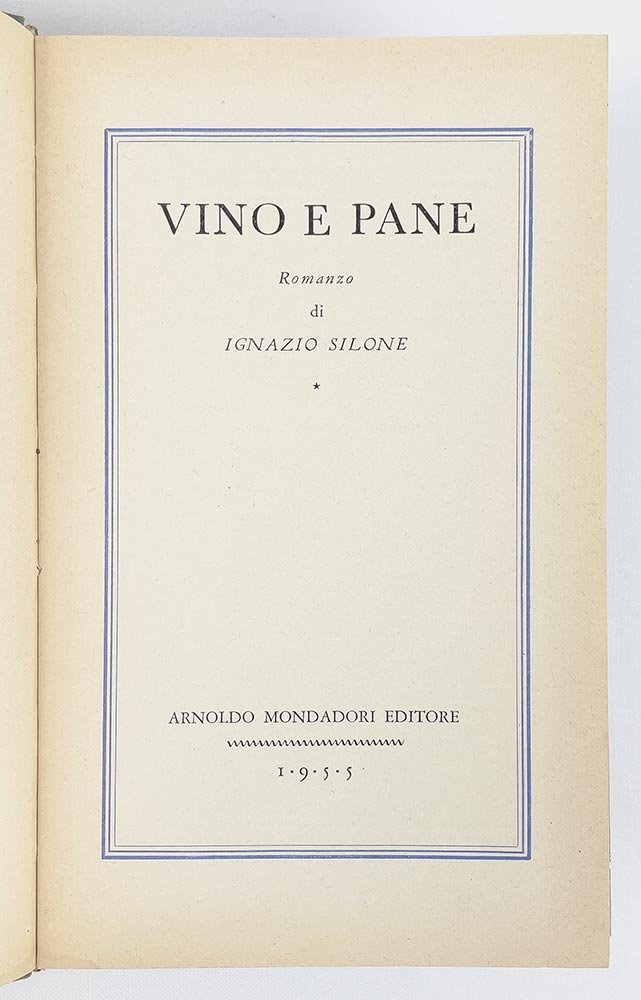 LIBRO Prima edizione definitiva, di molto modificata. Qualche contenuta e marginale lacerazione alla sovracoperta (piccola perdita alla testa del dorso); minimi segni di cedimento alle cerniere; per il resto più che buon esemplare. Quello che probabilmente è il capolavoro di Silone nella redazione definitiva, ampiamente modificata e con l’inversione nel titolo (pare dietro consiglio di Massimo Bontempelli — per evitare l’omonimia col ‘Pane e vino’ papiniano?). Prima edizione dell’opera a essere stampata in Italia, è la terza assoluta del testo in italiano. D’Eramo, Ignazio Silone (Roma 2014), pp. 146-ss
