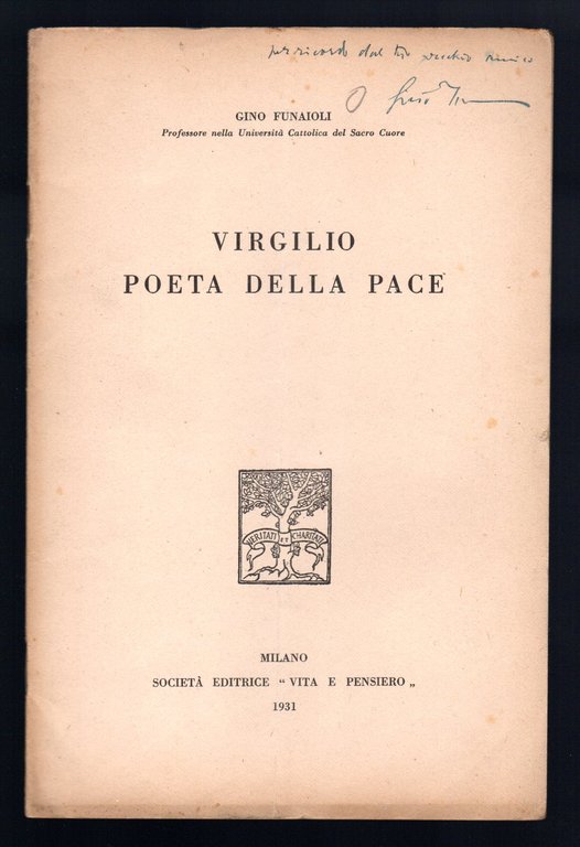 Opuscolo vintage. ESTRATTO DAL VOLUME TENUTE ALLA UNIVERSITÀ IN COMMEMORAZIONE DEL « CONFERENZE VIRGILIANE CATTOLICA DEL S. CUORE BIMILLENARIO VIRGILIANO, PUBBLICAZIONI DELL'UNIVERSITÀ CATTOLICA DEL S. CUORE SERIE QUARTA SCIENZE FILOLOGICHE VOLUME XII. Dedica autografa dell'autore. Piega centrale. Indirizzo in quarta con francobollo. Ordinario segno del tempo.
