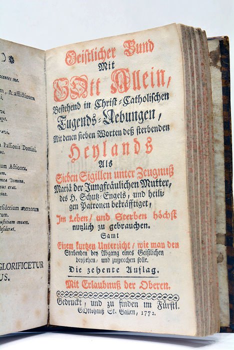 VISITATIO et cura infirmorum ex rituali Romano cum ordine administrandi viaticum et extremam unctionem. Adjunctâ quoque instructione, et methodo assistendi di Infirmis, et Agonizantibus. Editio Secunda. S. Galli, typis et sumptibus principal, 1755. RELIE AVEC (à la suite): 2). Geistlicher Bund mit Gott Allein, bestehend in Christ Catholischen Jugends Nebungen, mit denen sieben Worten dess sterbenden Henlands als Sieben Sigillen unter Zeugnuss Maria der Jungfräulichen Mutter, des H. Schuk Engels, und heiligen Patronen beträsstiget, Im Leben / und Sterben höchst nutzlich zu gebrauchen. Samt Einem fuessen untersicht / wie man den Sterbenden ben Abgang eines Geistlichen benstehen, und zusprechen solle. Die Zehente Auflag. St. Gallen, 1772.