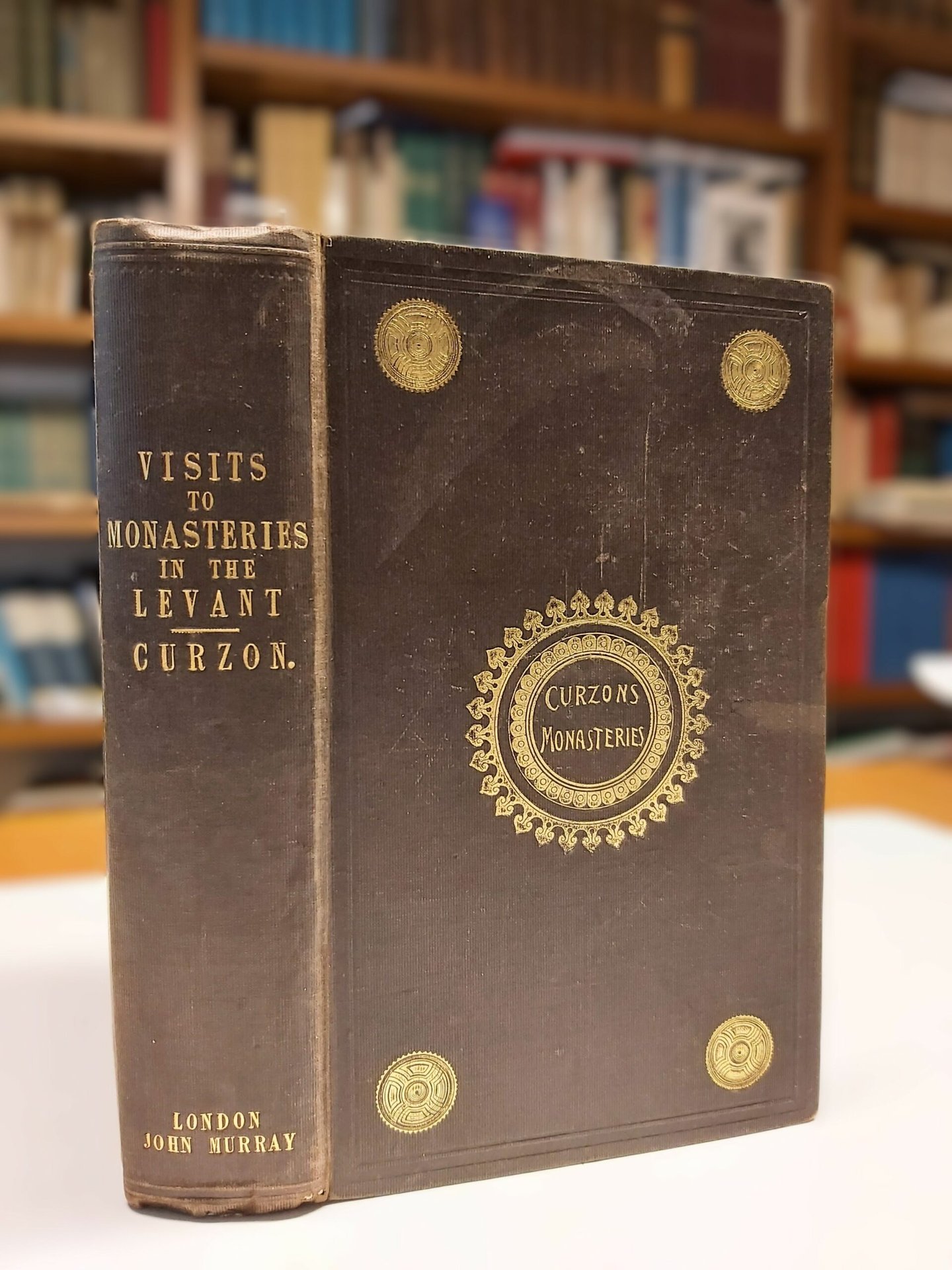 in-16, pp. LVI, 420, leg. t. tela edit. con tit. e impress. in oro ai piatti e al d. Con doppio antip. inc. in xilogr. raffigurante le Meteore e l’interno di un monastero in Grecia. Con 16 tavv. f.t. inc. in xilogr., protette da veline e raffiguranti personaggi in costume e belle vedute di località dell’Egitto, Monte Athos, Gerusalemme, Grecia. Trattato sui principali monasteri dell’oriente, culla della civiltà cristiana. Al fine interess. pagine con ricette della cucina turca. Qualche pagina ingiallita ma ottimo esempl. [038]