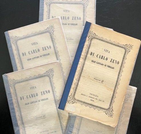 5 opuscoli in 16 (cm 12 x 18,5), pp. 305 (numerazione continua). Rinforzi ai dorsi. Brossure editoriali. Quarta edizione (cfr. Soranzo, 7049) pubblicata in 5 fascicoli separati (ma esiste anche l'edizione in volume unico) della vita di Carlo Zeno capitano dei Veneziani nato nel 1417.