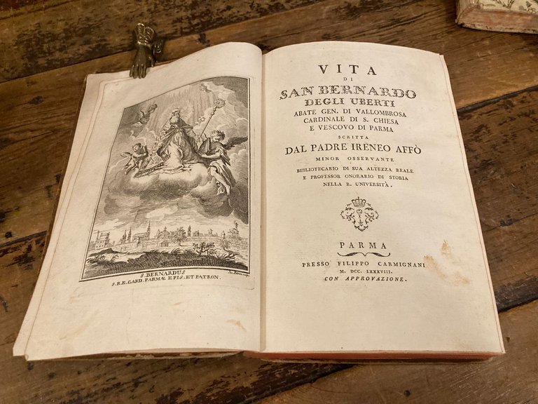 In-8° (21.2x14.5 cm), pp. XVI, 234 (2), legatura in piena pelle spugnata coeva con titoli e fregi dorati al dorso, sguardie in carta decorata, tagli rossi. Al controfrontespizio ritratto calcografico del Santo sovrastante una veduta di Parma. Fresco esemplare ad ampi margini. Prima non comune edizione di questa biografia del Santo e allo stesso tempo anche puntuale storia della città di Parma. Manca al Lozzi ma presente Modona, Bibliografia del Padre Ireneo Affò, n.48: 'Con questa Vita lodevolissima per sottile critica e copia di documenti pare l'Affò avesse in animo, a quanto ne dice nella prefazione, di dar principio ad una Serie dei Vescovi o Storia Ecclesiastica di Parma'. L'Affò (Busseto, 1741-Parma, 1797), frate minore osservante, erudito, Bibliotecario Ducale a Parma, biografo e storico è noto soprattutto per le 'Memorie degli scrittori e letterati parmigiani', compilate su incarico del Tiraboschi e proseguite poi dal Pezzana.
