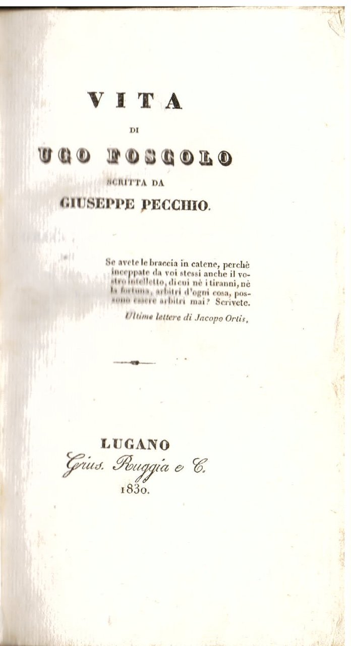 In-8° (200x115mm), pp. 288. Legatura del tempo m. pelle con titolo e fregi ornamentali in oro al dorso. Piatti marmorizzati. Manca il ritratto del Foscolo inciso su acciaio all'antiporta. Bell'esemplare. Edizione originale della principale biografia foscoliana dell'Ottocento, pubblicata appena tre anni dopo la morte del poeta. Ancorché la data al frontespizio sia quella del 1830, il volume, come conferma l'Acchiappati, uscì in realtà nel gennaio del 1831. Ottolini, n. 439. Acchiappati, n. 143. Mazzolà, II, p. 96.