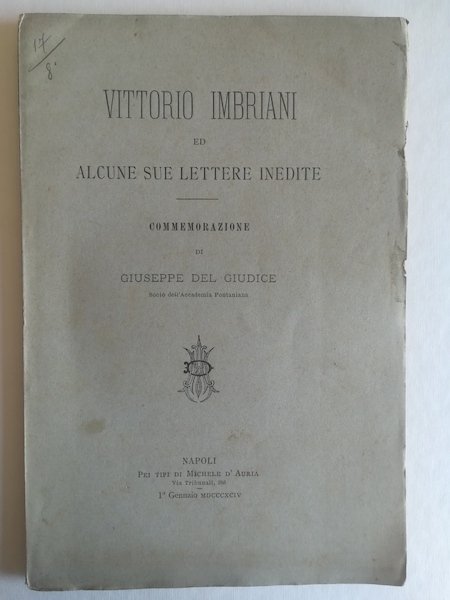 In 8 (cm 16 x 24,5), pp. XL + 32. Pagine intonse. Fioriture sparse alle pagine. Brossura editoriale. Saggio introduttivo di Giuseppe Del Giudice, seguono, alcune lettere inedite di Vittorio Imbriani.