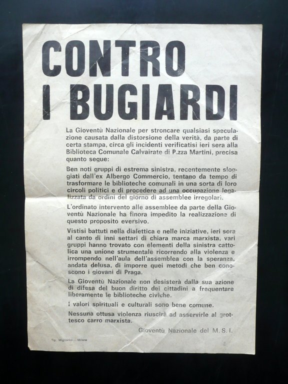 Volantino, Contro i bugiardi La Gioventù Nazionale per stroncare qualsiasi speculazione causata dalla distorsione della verità, da parte di certa stampa, circa gli incidenti verificatesi ieri sera alla Biblioteca Comunale Calvairate di P.zza Martini, precisa quanto segue:" [.] Tip. Migliorini, Milano, s. d. (anni '50 - '60 circa); volantino a stampa su foglio in carta; testo riprodotto ad entrambi i lati. Cm 24,5x17,5. Condizioni di conservazione Esemplare ben conservato con tracce d'uso, piega centrale di conservazione, alcune tracce di pieghe e minimi lievissimi aloni. SC03.D13493 N "