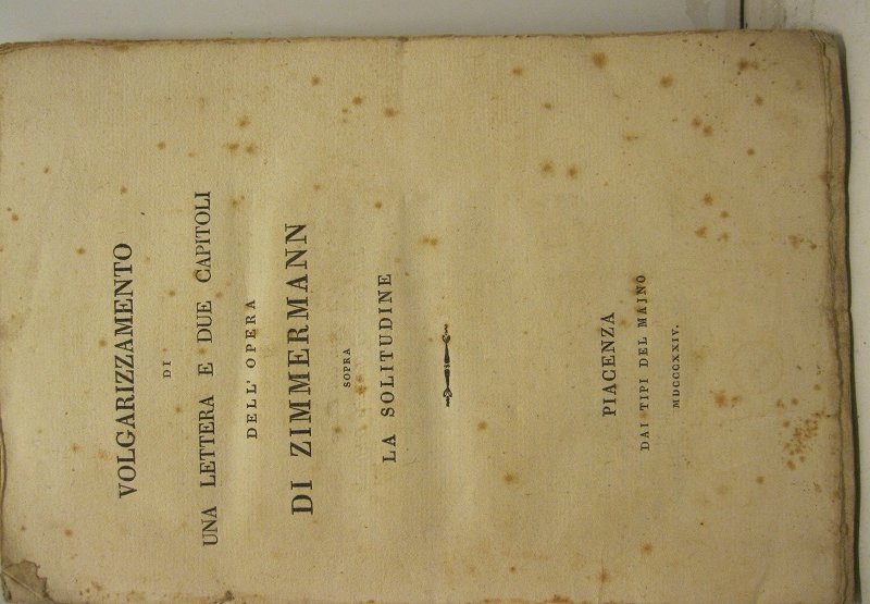 In 8, pp. 62. Br. con danni al d. Zimmermann nasce a Brugg (Berna) nel 1728, studia medicina a Gottinga. Nel 1756 esce il suo primo saggio sulla solitudine, frutto anche delle sue riflessioni di uomo malinconico. Si trasferisce poi in Inghilterra diventando il primo medico del Re d'Inghilterra ad Hannover. Pubblica successivamente il Trattato sulla Solitudine che gli vale la stima e l'amicizia dell'imperatrice di Russia, e si dedica a studi storici e politici. Muore nel 1795.