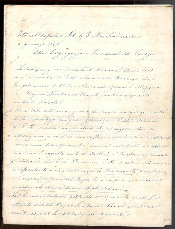 Voto alla Congregazione Provinciale di Venezia ambito del Regno Lombardo-Veneto, 4 Gennaio 1848 Manoscritto originale