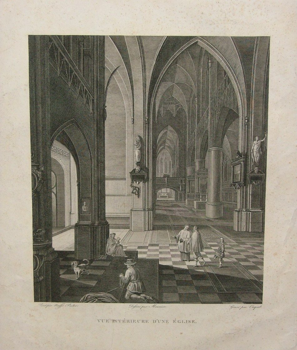 Stampa di cm. 60 x 45 ca. Raffigurante l'interno di una Chiesa con personaggi.
