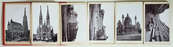 Vol. in -16 (11,5 x 17 cm.), legatura telata rossa con decori incisi in nero e oro sul piatto ant., N. 20 fotografie in b.n. legate a soffietto raffiguranti vedute di Vienna. In buono stato di conservazione - Ex-Libris Emilio Delfino (cartografo e pittore) applicato all'interno della 2. di copertina.