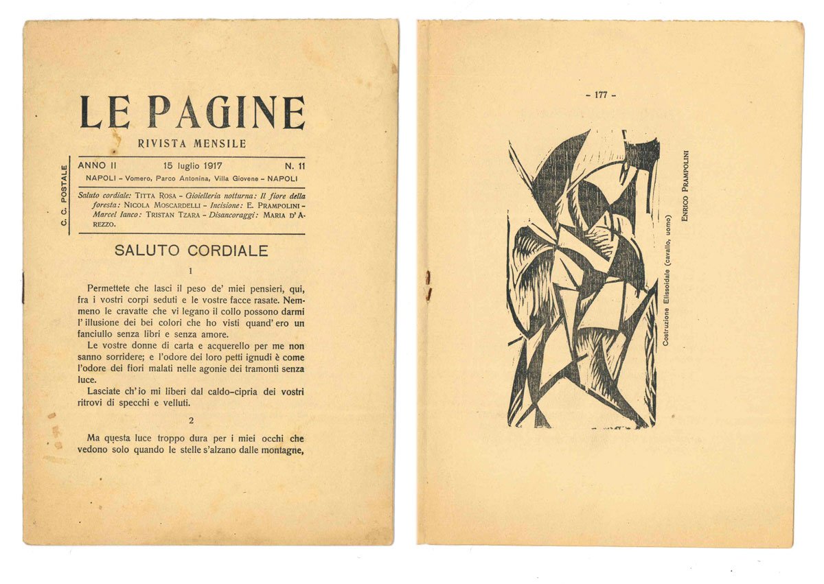PERIODICOEdizione originale.Ottimo esemplare.Numero ricco della rivista d’avanguardia napoletana animata dai “liberisti” Titta Rosa e Moscardelli e dai dadaisti D’Arezzo, Tzara, Prampolini e altri. Oltre alla xilografia di Prampolini segnalata in titolo, contiene alcuni versi da «Gioielleria notturna» di Moscardelli, la presentazione «Mouvement Dada: Marcel Janco» di Tristan Tzara e alcune pagine con i «Disancoraggi» in prosa di Maria D’Arezzo.