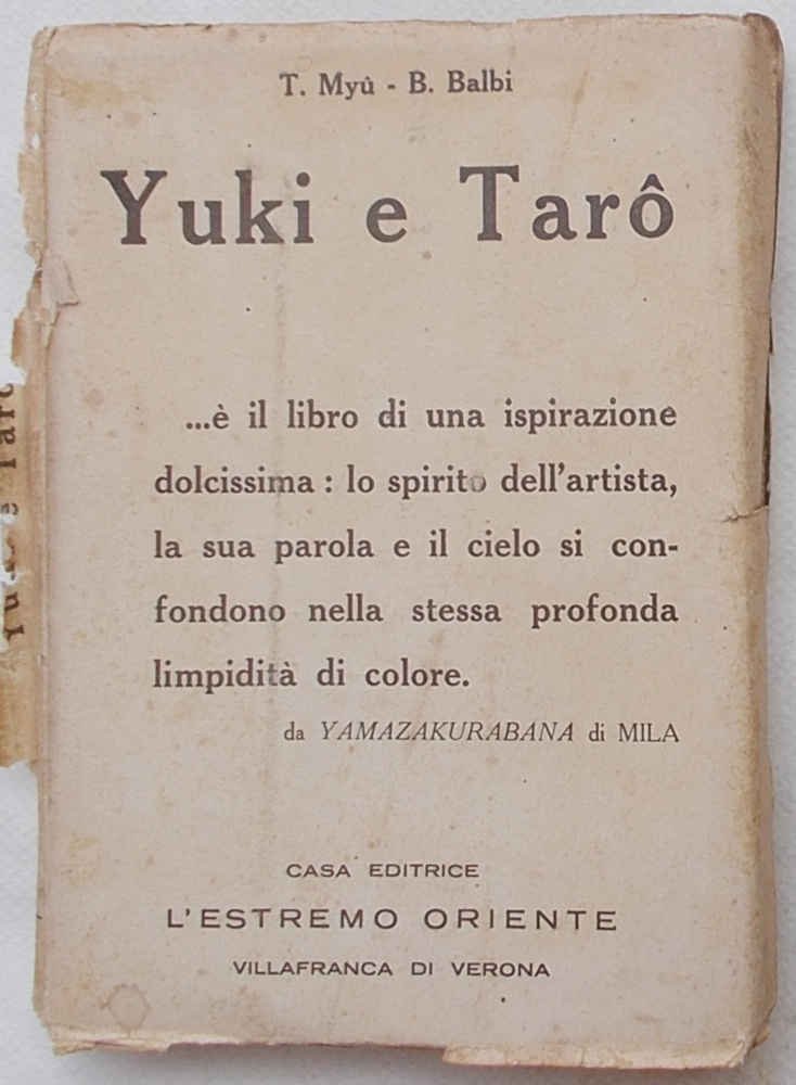 In 16° (cm. 18 x 13); pagg. 235 + 16 (saggio di "Yamazakurabana); brossura originale con piccoli difetti restaurati al dorso, ma ottimo. Firma. VG-. ** "Parlano e cantano tutti d'amore i bellissimi romanzi di T.Myu - B. Ballbi. ma quanta nobiltà e purezza pur enell'ardore della loro umana passione!"