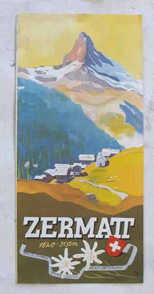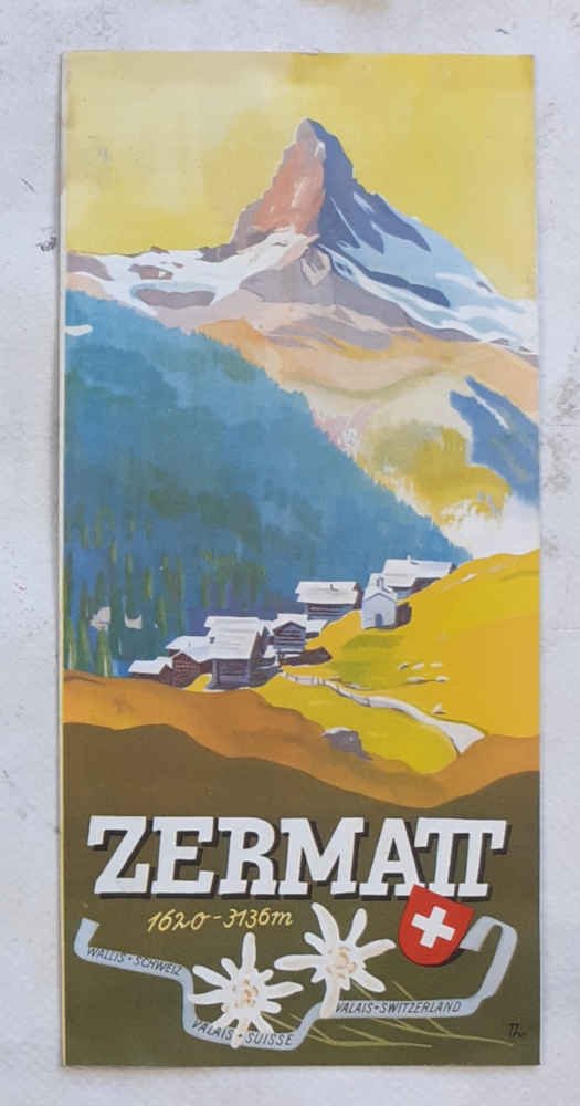 Pieghevole di 8 facciate di cm. 20,7 x 9,7; con una cartina a colori doppia e alcuni disegni a due colori; copertina grafica a colori molto molto bella! (due soggetti: villaggio con Cervino sullo sfondo; trenino del Gornergrat). Minima traccia d'umido, ma ottimo. VG-.