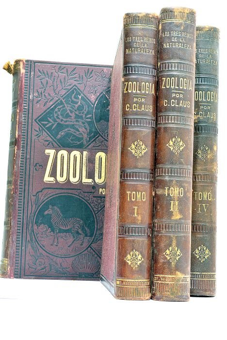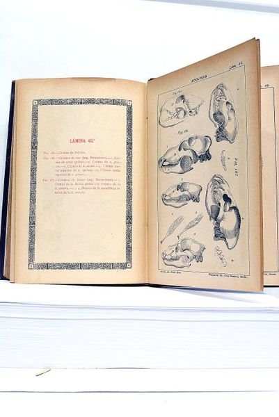 4 volumes (tome 1, 2, 4 et 5): 1). 400 pages + 2 pages non chiffrées + 37 planches hors-texte 2). 392 pages + 2 pages non chiffrées + 32 planches hors-texte 3). 367 pages + 2 pages non chiffrées + 38 planches non chiffrées 4). 506 pages + 8 pages non chiffrées + 49 planches hors-texte (manque le tome 3) (15x23cm). Percaline de l'éditeur. Dos et Plats frottés. Petits défauts à la coiffe du tome 5. Papier uniformément bruni. Assez bon exemplaire à l'intérieur. Très Nombreuses Planches représentant des Animaux. Livre en Espagnol.
