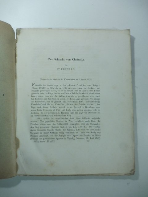 In 8 (cm 23 x 28,5), pagine numerate da 129 a 290 con 3 tavole finali ripiegate incise in litografia con cartina e disposizione dei corpi sul campo di battaglia. Brossura muta coeva con titolo manoscritto al piatto anteriore. Stralcio editoriale da 'Gelesen in der Akademie der Wissenschaften'. Saggio relativo alla battaglia di Chotusitz combattuta tra Boemia, Austria e Prussia nella prima guerra di Slesia durante la guerra di successione austriaca.