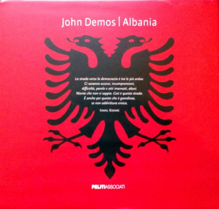 Con 75 fotografie a colori e bicromia di John Demos. Testo di Ismail Kadare in francese . 4to. pp. 144. . Perfetto (Mint). . Prima edizione (First Edition). . ''Ci troviamo nel cuore dei Balcani, la penisola che non smette di turbare il suo continente madre, l'Europa. I soggetti fotografati sono Albanesi tormentati, della fine del ventesimo secolo, mentre il fotografo, John Demos, è greco, meglio ancora, originario del nord della Grecia, nato e cresciuto vicino all'Albania. I greci e gli albanesi formano una coppia di vicini tra i più antichi, se non addirittura i più antichi, del continente. Non si registrano, a memoria d'uomo, casi di vicini che non abbiano avuto problemi tra di loro. Se questa è una verità che nessuno ignora, è valida due volte di più per i Balcanici. Soprattutto vicini di lunga data. In questo album si incontrano. La macchina fotografica è tra le mani di un greco, le immagini e i volti sono albanesi. Missione impossibile?''.