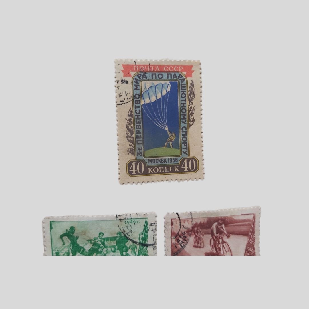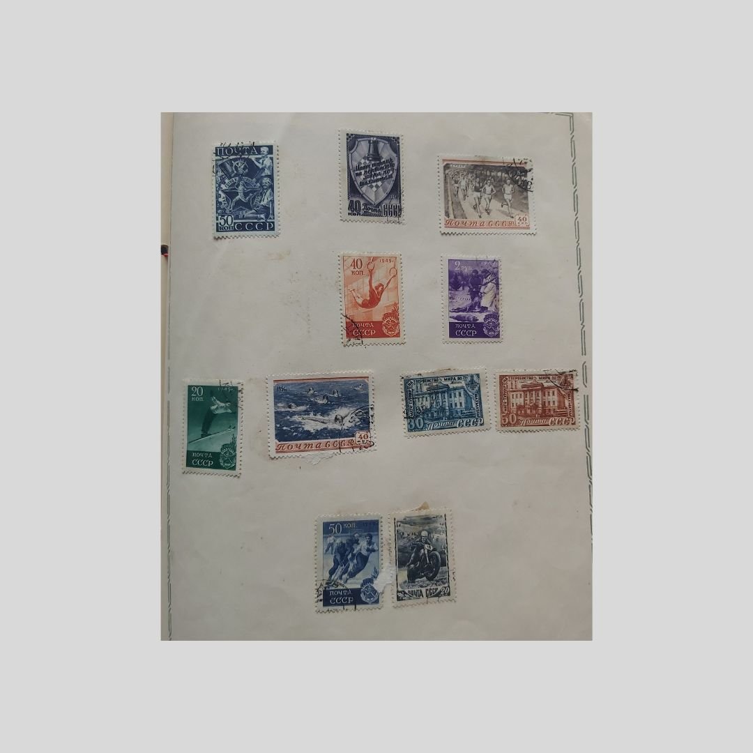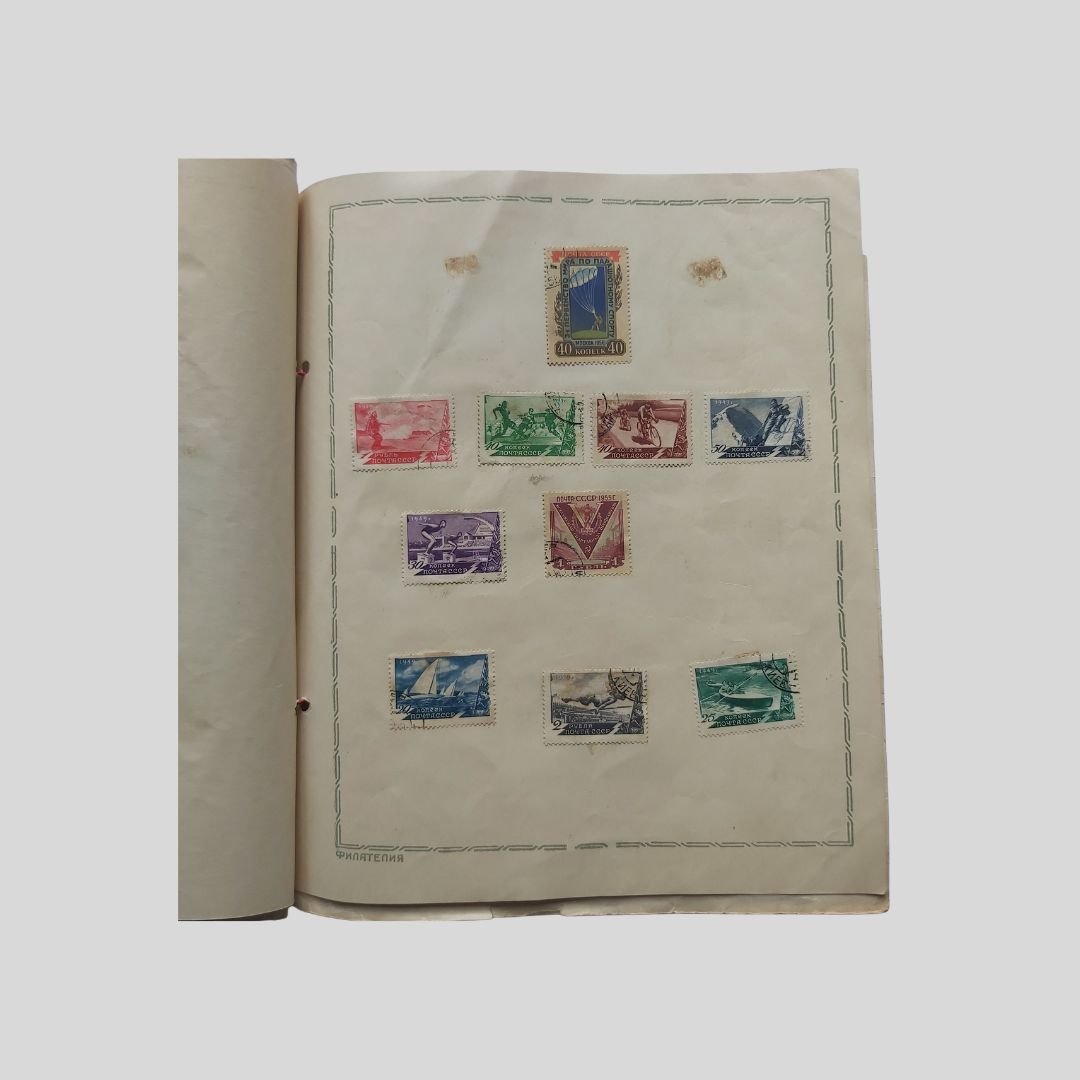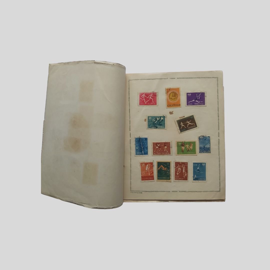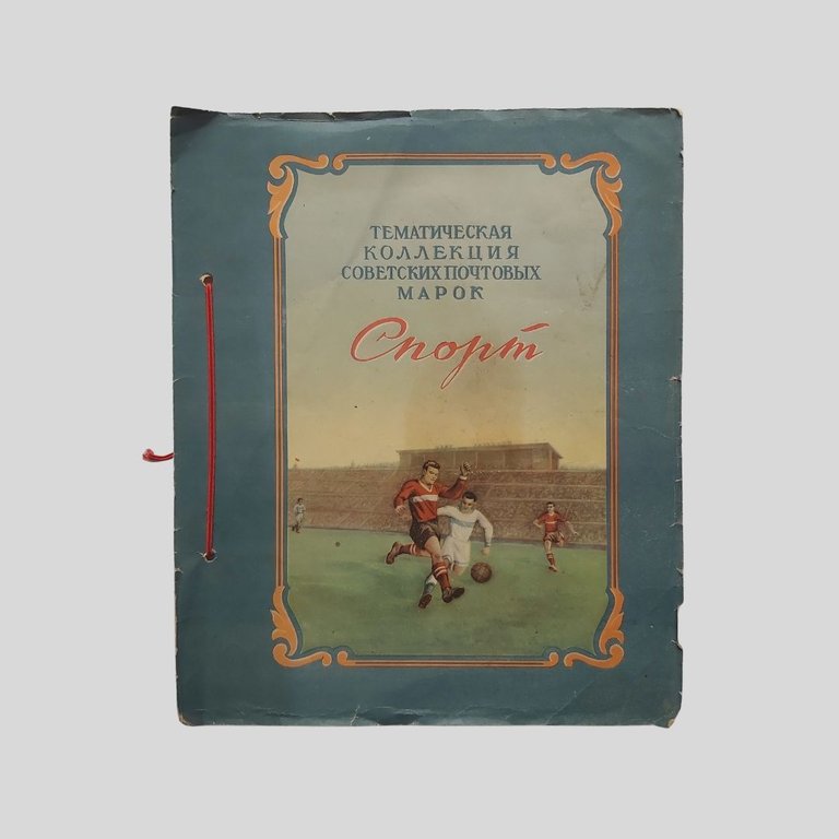 Cop. illustrata di V. Evdokimov. Dimensioni: cm 22,5×27, pp. 8 nn. I francobolli usati, con tracce di timbri postali, sono incollati, come d’uso nell’epoca, e applicati manualmente al solo recto delle pagine. Tracce d’uso: Piegoline d’archiviazione, mancanza (cm 4 ca.) al margine superiore bianco della quarta di copertina che non lede la conservazione e leggibilità dell’album. La raccolta documenta diverse discipline sportive tra il 1946 e il 1956, includendo la serie celebrativa delle Spartakiadi, , le grandi manifestazioni sportive multidisciplinari organizzate nell’Unione Sovietica e in altri paesi del blocco comunista, concepite come alternativa proletaria e socialista ai Giochi Olimpici “borghesi”. Tra le diverse discipline sportive: Atletica, Ginnastica artistica, Scherma, Ciclismo, Calcio, Basket, Canottaggio, Nuoto, Tennis, Pallavolo, Tuffi, Sci, Pesi, Pugilato, Paracadutismo…
