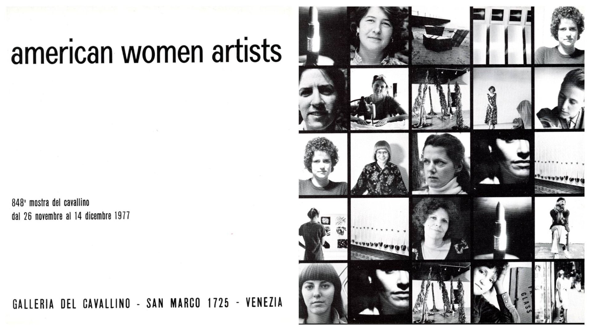 Pieghevole della mostra alla Galleria del Cavallino, Venezia 26 novembre - 14 dicembre 1977. Elenco e fotografie delle artiste partecipanti: Edith Altman, 1931 - Nancy Angelo, 1953 - Andrea Blum, 1950 – Lyn Blumenthal, 1948 - Betsy Damon, 1940 - Mary Cairns, 1953 - Candace Compton, 1950  - Carole Fsher, 1942 - Carole Gallagher, 1950 - Cherie Gaulke, 1954 - Janice Helleloid, 1949 - Janet Dubrul Sullivan, 1949 - Paula Jeanine Sweet, 1949 . Cm 20x19. . . Molto buono (Very Good). . . .