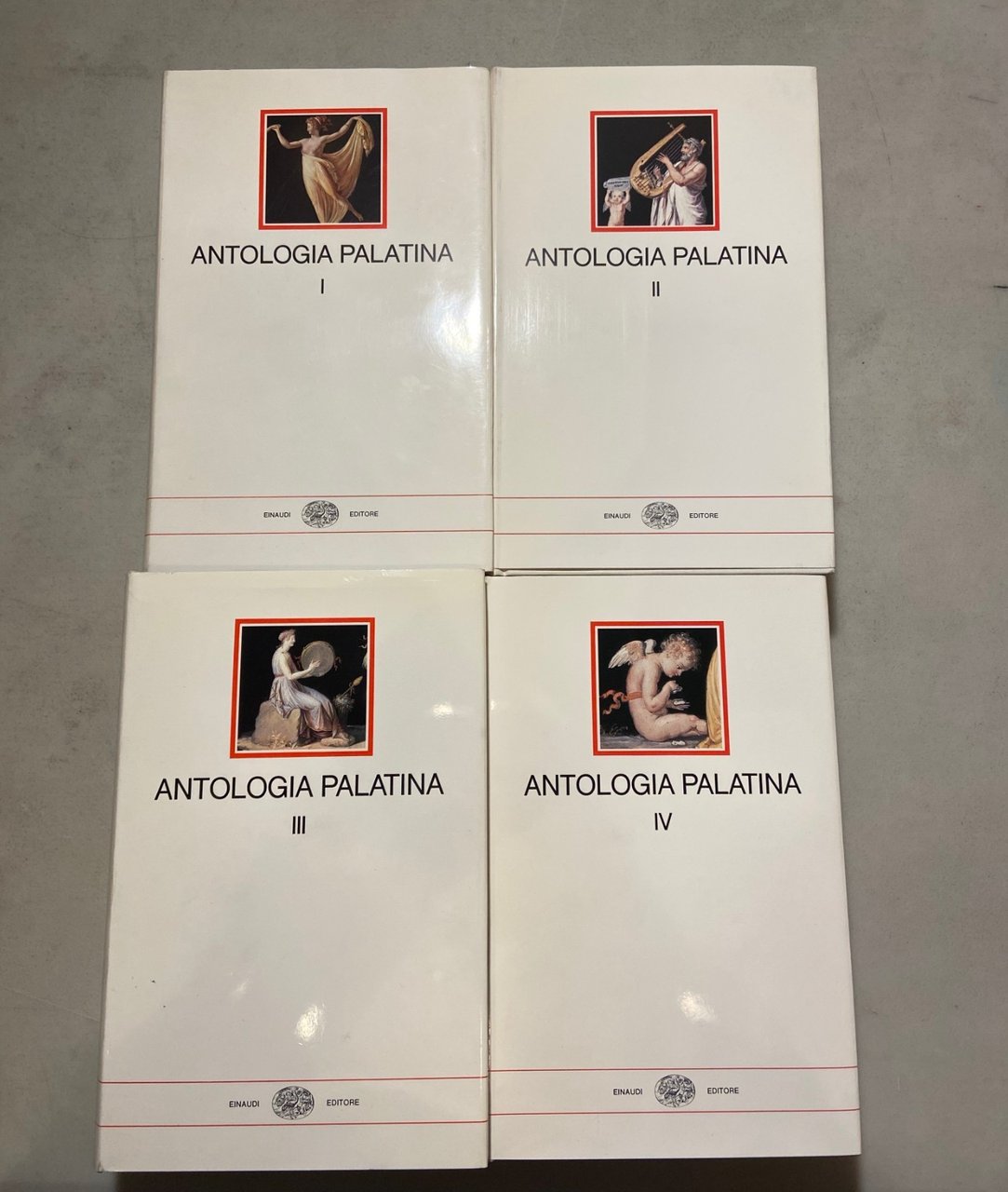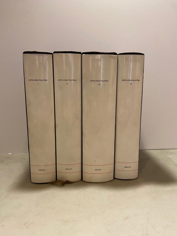 A cura di Filippo Maria PontaniANTOLOGIA PALATINA Collana I MILLENNIPresenti illustrazioni all’internoGiulio Einaudi editore, Torino, 1978Edizione bilingue greco-italianoBrossura, 21,9x14,1 cm, pp. 2338 (IN TOTALE)Peso: 4kgVOLUMI:I. Volume primo, Libri I-VIII. Volume secondo, Libri VII-VIIIIII. Volume terzo, Libri IX-XIIV. Volume quarto, Libri XII-XVIcod: 5430CONDIZIONI DEL LIBRO:Ottime, non ci sono difetti da segnalare.Lievi macchie sulla sovraccoperta.