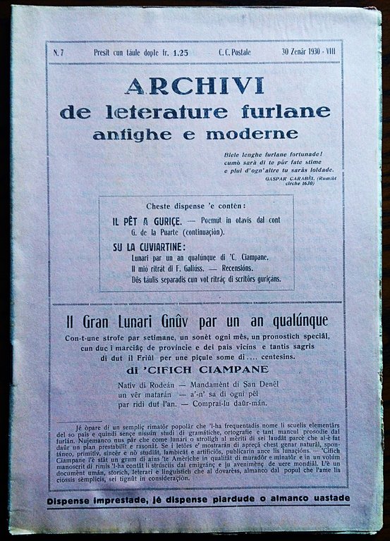 Archivi de leterature furlane antighe e moderne. N. 7 30 Zenar 1930.
