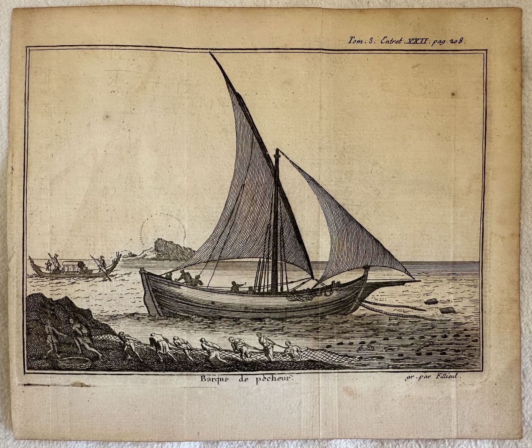 Deliziosa acquaforte del 1735 che mostra una barca di pescatori. In buone condizioni. TECNICA: Acquaforte AUTORE: Filleul ATLANTE: Le spectacle de la nature DIMENSIONI FOGLIO: cm 19,5x16,5 DIMENSIONI INCISIONE: cm 17,5x12,5 EPOCA: 1735 CONDIZIONI: Buone, Piegature.Nice etching of 1735 showing a fisher boat. <BR>In good conditions. TECHNIQUE: etching AUTHOR: Filleul ATLAS: Le spectacle de la nature PAGE SIZE: cm 19,5x16,5 PRINT'S SIZE: cm 17,5x12,5 PERIOD: 1735 CONDITIONS: In good conditions. Foldings