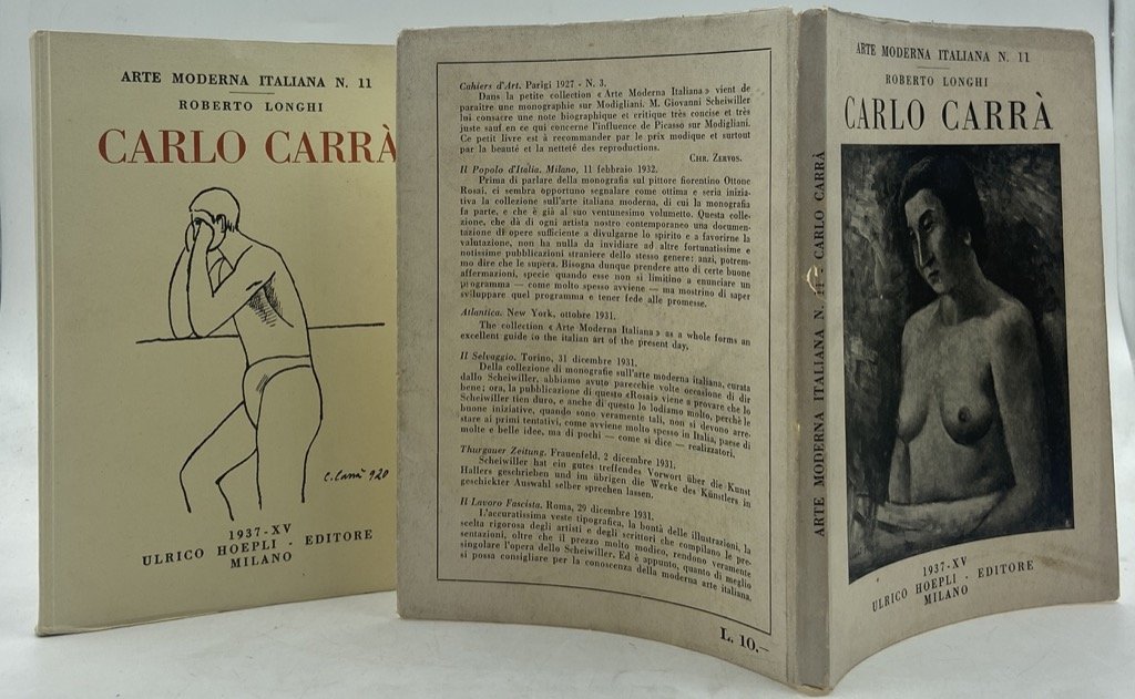 Brossura editoriale con sovraccoperta illustrata, cm 17.5 x 12.5, pp 16 (64), XXX tavole inclusa l’antiporta a colori. Leggeri difetti sulla sovraccoperta. Edizione originale, tirata in 1000 esemplari numerati a macchina, di questa undicesima monografia della serie Arte Moderna Italiana curata da Giovanni Scheiwiller, straordinaria collezione che tra il 1925 e il 1951 testimoniò la profonda conoscenza del mutamento delle arti e l'intelligenza nella scelta degli autori dell'editore milanese. Il testo di Roberto Longhi è accompagnato da una estesa bibliografia e note biografiche; 33 tavole, inclusa l'antiporta a colori, con opere tra il 1912 e il 1936, sulla brossura riprodotto un disegno del 1920.