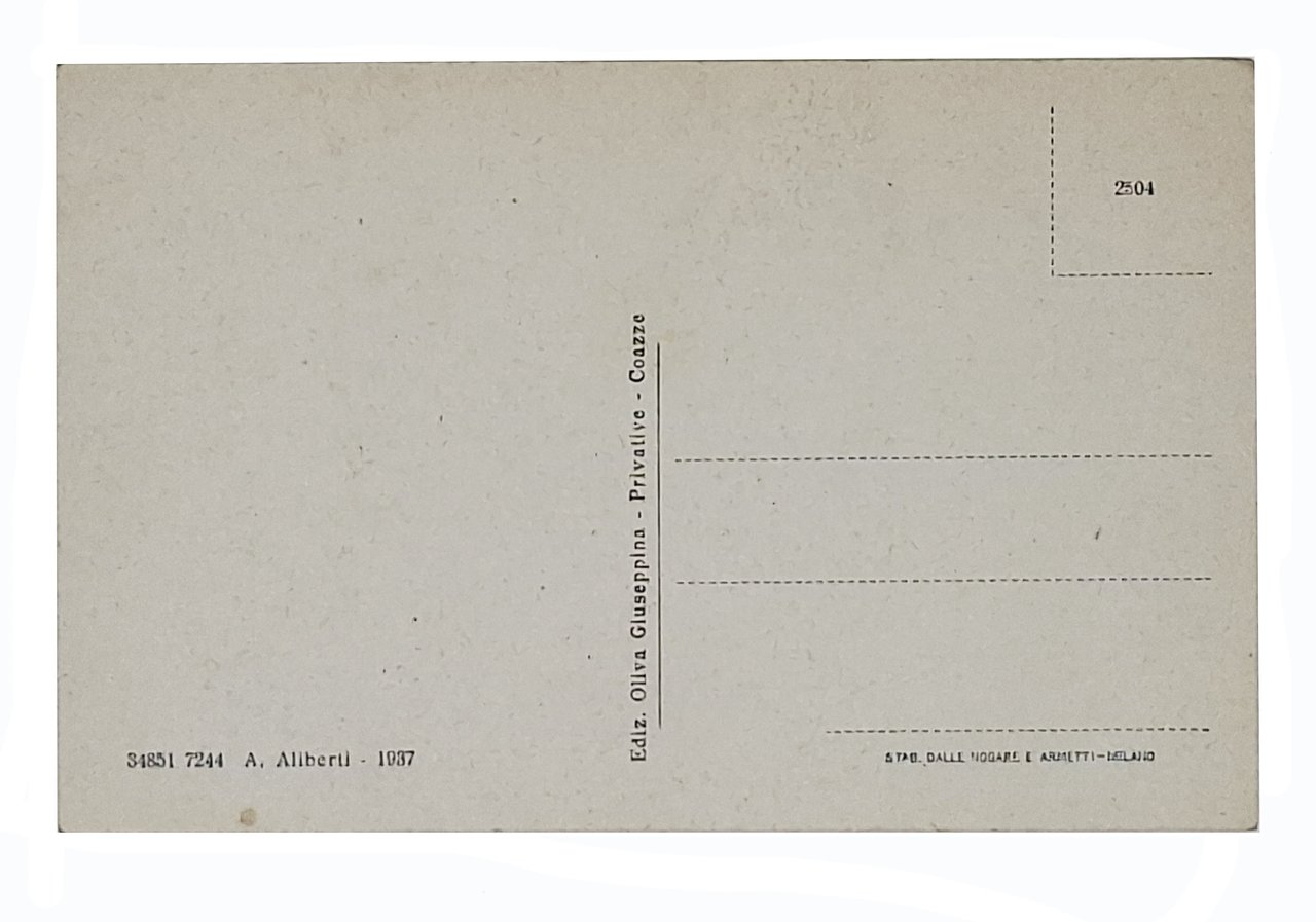 Cartolina postale non viaggiata, di dimensioni 14 x 9 cm circa. 34851 7244 A. Aliberti - 1937. Stabilimento dalle Nogare e Armetti - Milano. Illustrata in nero. Decisamente ben conservata.
