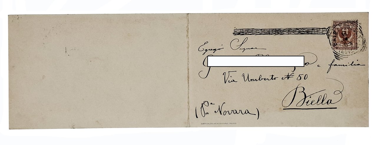 Cartolina doppia (dimensioni aperta: 28 x 9 cm circa), viaggiata. Eliot. Calzolari & Ferrario - Milano. Illustrata da Gilardi, in nero, sulle due facciate. Decisamente ben conservata.