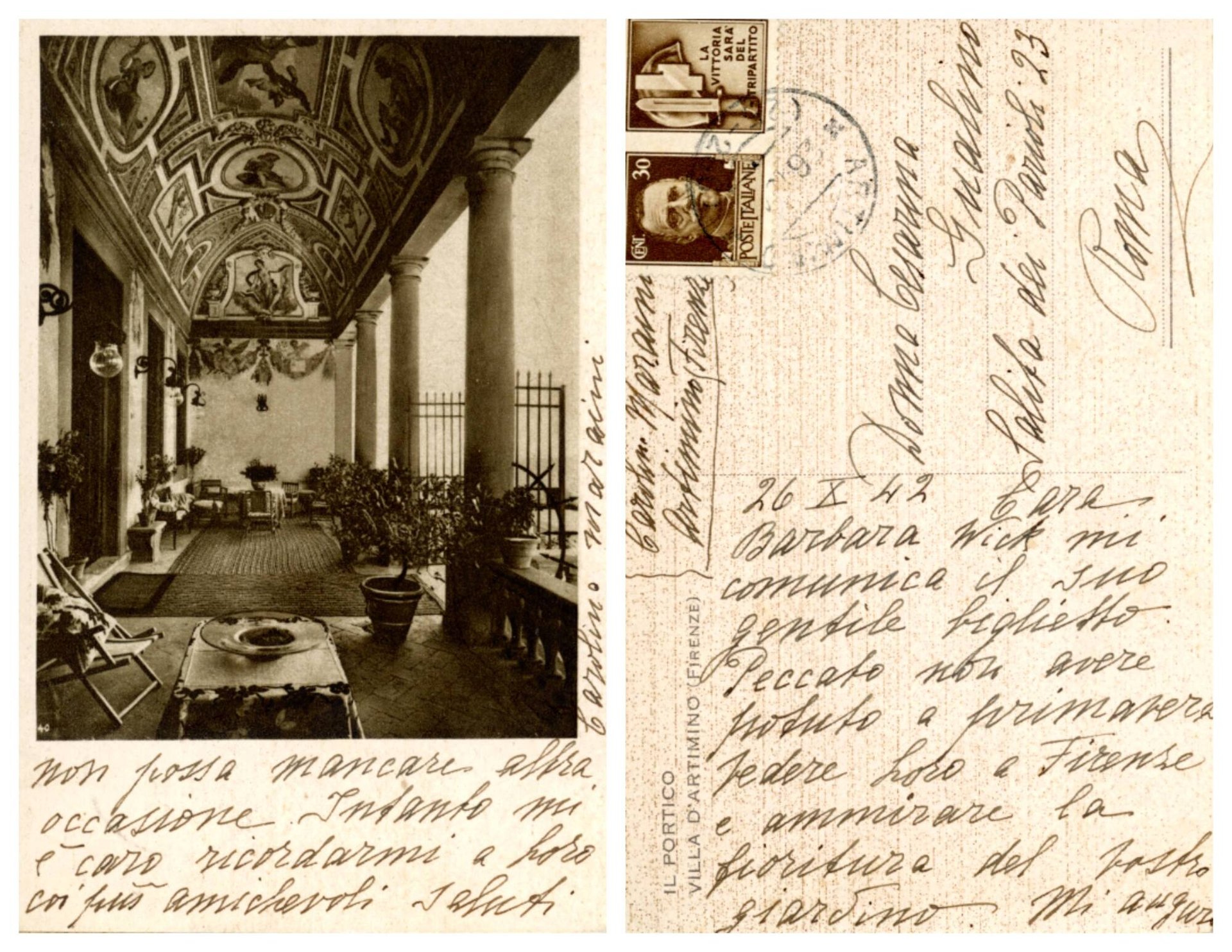 Cartolina autografa di Carolina Sommaruga Maraini inviata a Cesarina Gualino il 26 ottobre 1942. Cartolina con la riproduzione del Portico della villa medicea di Artimino (1596-1600) che nel 1911 fu acquistata dalla famiglia Maraini . Cm 9x14. . . Ottimo (Fine). . . .
