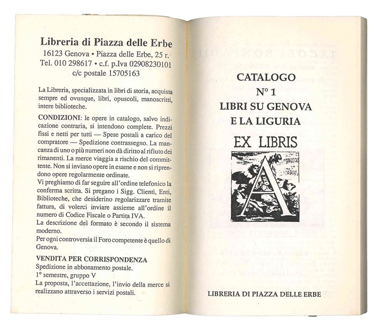 Mm. 188x113. Pp. non numerate. Presenti illustrazioni in b/n n.t. Catalogo della libreria di Piazza delle Erbe di Genova. Brossura editoriale con titolo alla cop. ant. (brossura con restauro manuale, in parte coprente le copertine).