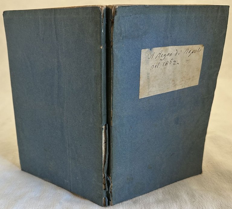 Rarissima edizione originale, pubblicata in forma anonima, di questa monografia antiunitaria che descrive le condizioni delle provincie del Regno delle due Sicilie ad un anno dalla conquista piemontese. Senza data ma del 1863. Aspra critica al governo piemontese ad un anno dall'indipendenza. In buone condizioni. Copertina morbida coeva con titolo manoscritto su etichetta al piatto angteriore in discrete condizioni generali con usure e mancanze al dorso. Legatura in buone condizioni. All'interno le pagine si presentano in buone condizioni con fioriture. In 8. Dim. 20x13,5 cm. Pp. (4)+258.Very scarce anonymous original edition of this monography about the conditions of the Reign after the conquer of Piedmont. Not dated but of 1863. It is a sharp critic about Piedmont government. In good conditions. Soft coeval cover with handwritten title in the front plate in fair general conditions with wearings and lackings in the spine. Binding in good conditions. Inside pages are in good conditions with foxings. In 8. Dim. 20x13,5 cm. Pp. (4)+258.
