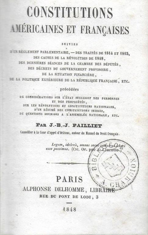 Condtitutions Américaines et Françaises suivies d'un Réglement parlementaire. - des traité de 1814-1815, de causess cde la révolution de 1848. | Libri antichi e moderni | Pailliet J.B.J.