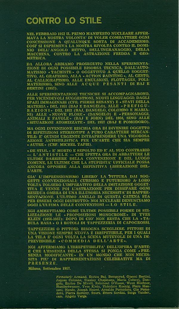 Secondo manifesto del Movimento Arte Nucleare che, dopo l'affermazione della volontà di combattere ogni accademismo, risalente al primo manifesto, afferma ora l'irripetibilità dell'opera d'arte. Testo in italiano, francese e inglese, stampato fronte retro su foglio di cartoncino ripiegato in tre parti, da un lato con scritte gialle su fondo nero e dall'altro lato con scritte nere su fondo grigio. Copertine di velina azzurra. Il manifesto è firmato da Armand, Enrico Baj, Bemporad, Gianni Bertini, Jaques Calonne, Stanley Chapmans, Mario Colucci, Danerlo, Enrico De Miceli, Reinhout D'Haese, Wout Hoeboer, Hundertwasser, Yves Klein, Théodore Koenig, Piero Manzoni, Nando, Joseph Noiret, Arnaldo Pomodoro, Giò Pomodoro, Pierre Restany, Saura, Ettore Sordini, Serge Vandercam, Angelo Verga . 4to (cm 30,5x17). . . Ottimo (Fine). . . .