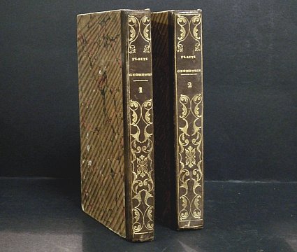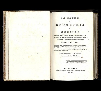 Emendati in que' luoghi, in cui una volta furono viziati da Teone, o da altri; e ne' quali sono restituite alcune definizioni e dimostrazioni dello stesso Euclide dal Cav. V. Flauti, Professore di Analisi Sublime nell'Università degli Studi di Napoli, e membro della Giunta di Pubblica Istruzione: Segretario della Reale Accademia delle Scienze di Napoli; e Socio ordinario di questa, dell'Istituto d'Incoraggiamento, e della Pontaniana; Membro Onorario della Società Reale di Copenahen, dell'Accademia di berlino, ec. ec. Volume I che contiene i primi sei Libri degli Elementi di Euclide. Volume II che contiene i libri Undecimo, Duodecimo, e Decimoterzo degli Elementi di Euclide; il Primo Libro di Archimede sulla sfera e sul cilindro; quello della misura del cerchio; e le note critiche e geometriche. Nelle appendici: ''Esercitazioni geometriche sul corso di geometria elementare e sublime''. Con 24 tavole ripiegate f.t. 2 volumi Incisioni oro al dorso. 8vo. pp. Vol. I: LXVIII - 226 - XX di esercitazioni - 14 tavole; Vol. II 231 a 570 - XXXIV di esercitazione - 10 tavole. . Molto buono (Very Good). Fioriture leggeread alcune pagine. Strapppo alla tavola I del libro I (Some light yellowing). . .