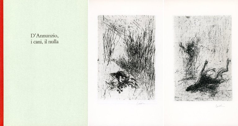 Basato su annotazioni, frasi, versi e poesie inedite che D'Annunzio scrisse in margine a libri, dizionari, riviste, documenti e lettere. Con tre incisioni all'acquaforte originali di Luciano Cottini, di cui due a piena pagina firmate ed una nel testo, non firmata (cm 17x11,3 e 9,3x11,3) Edizione originale di 100 + XX esemplari numerati e firmati al colophon. cm 26x17. pp. 22. . Ottimo (Fine). . Prima edizione (First Edition). Libri d'artista italiani del Novecento [Jentsch, 1993] Jentsch Ralph, I libri d'artista italiani del Novecento. Torino, Allemandi.
