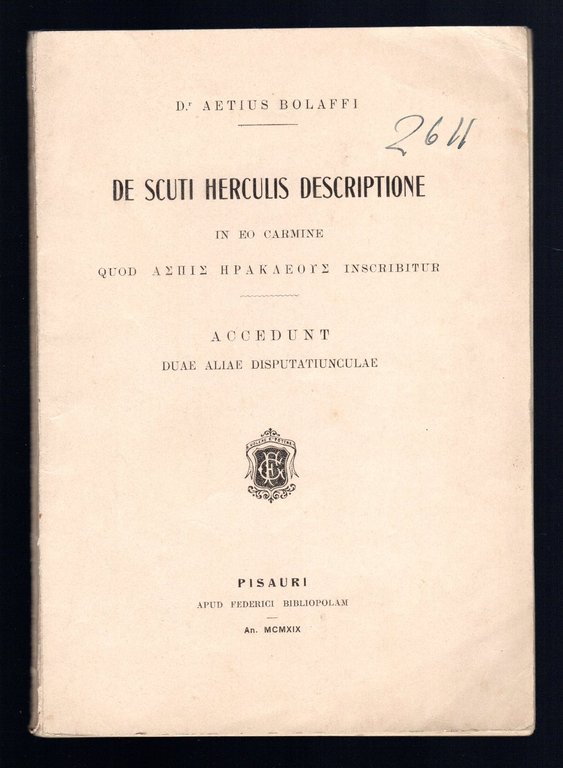 Opuscolo vintage in-8° con 91 pagg, Pesaro, 1919. Saggi. Testo in lingua latina. Note a matita in copertina e all'interno. Note a biro in ultima bianca. Dedica autografa dell'autore in prima bianca.